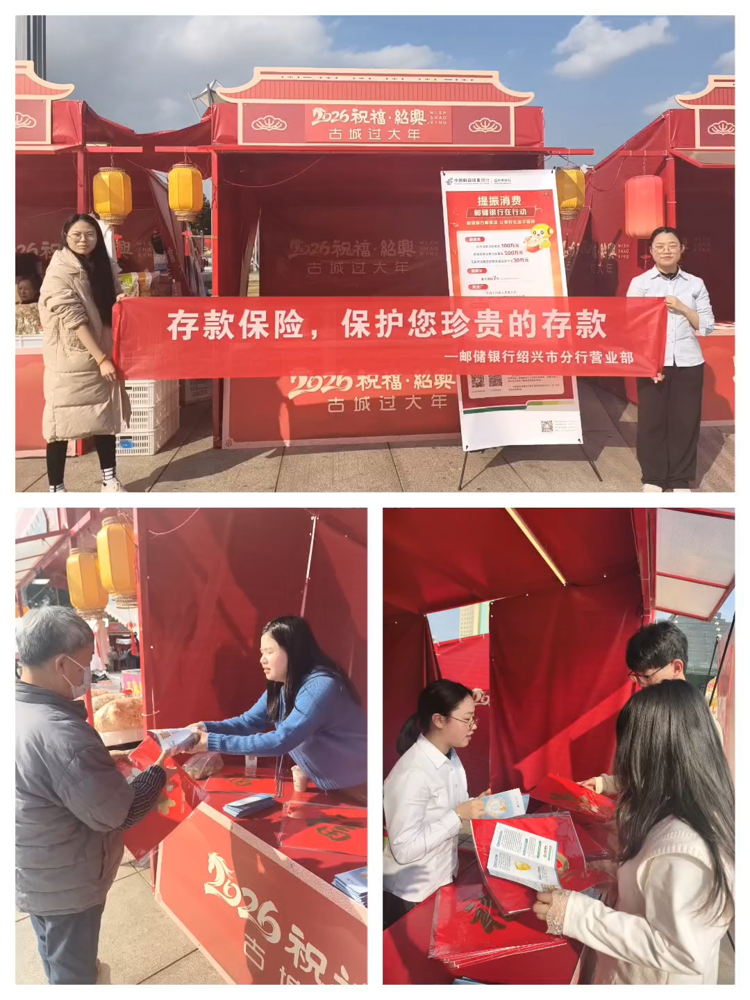 春节期间,“2026祝福·绍兴 古城过大年”系列活动火热开展,邮储银行绍兴市分行营业部借势新春市集热潮,走进活动现场开展“存款保险,保护您珍贵的存款”主题宣传,将金融安全知识送到市民身边。