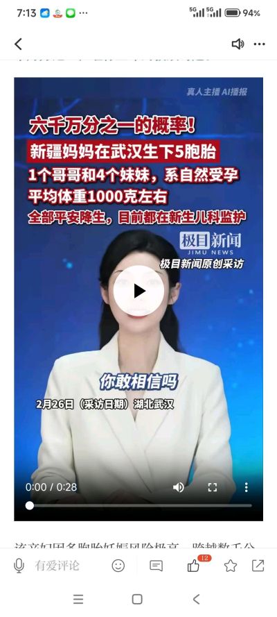 2月26日凌晨3时许,一位来自新疆的24岁产妇在武汉成功分娩五胞胎。医学数据显示,全球自然受孕五胞胎的出生概率仅为六千万分之一,堪称生命的极致奇迹。