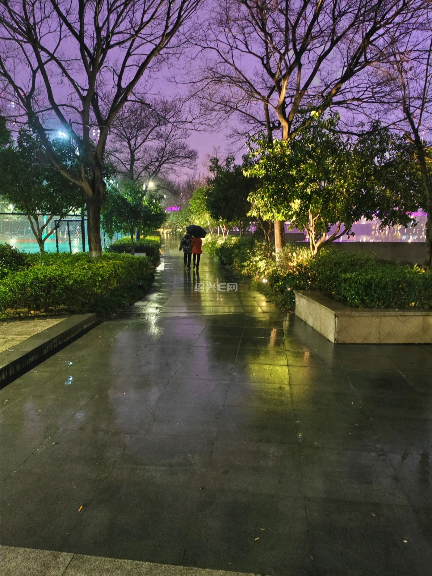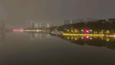 今天蒙蒙细雨下了一整天了,空气中充满了潮湿的味道,夜晚本来很热闹的梅山江两岸,人都不见了,要是在天气好的时候,这里散步、唱歌、练乐器的人可不少呢