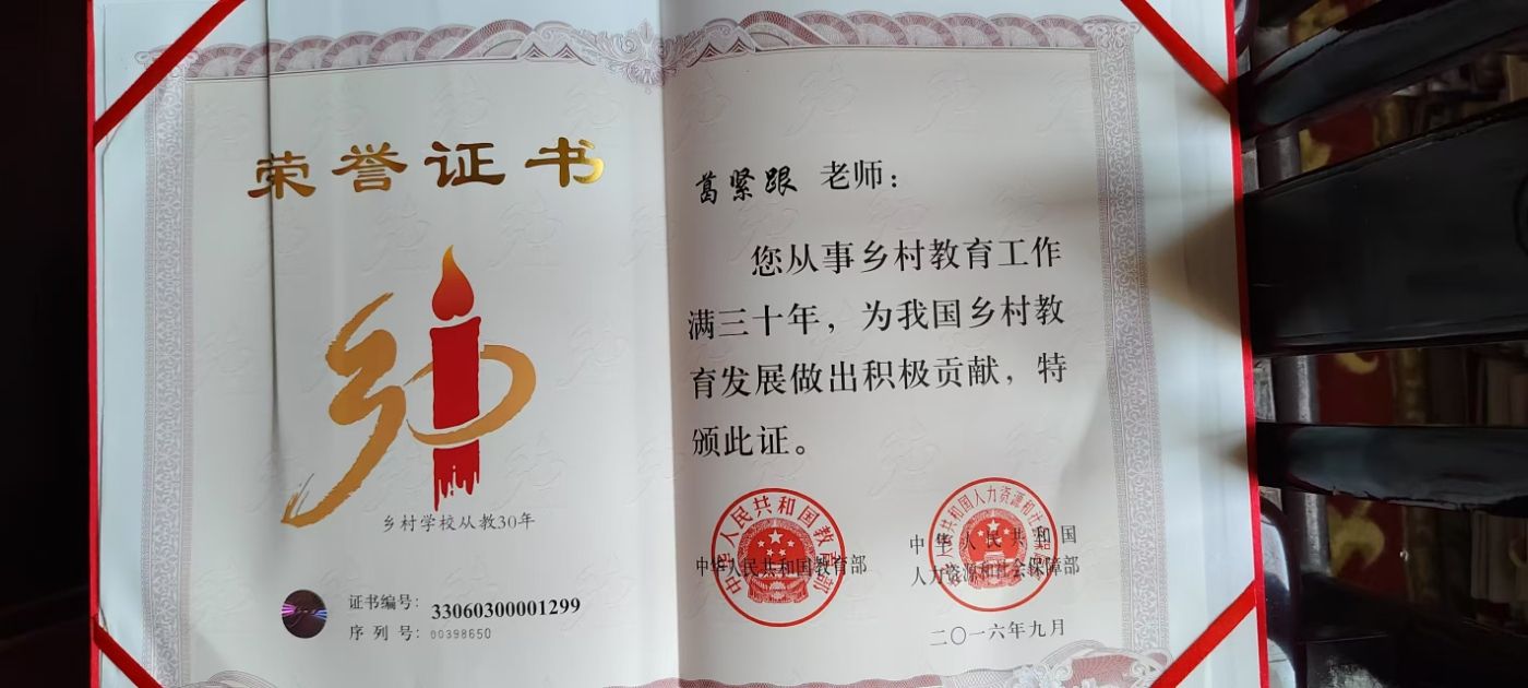 2016年葛紧跟老师获得中华人民共和国教育部与中华人民共和国人力资源和社会保障部联合颁发的从事乡村教育满三十年为我国乡村教育作出积极贡献的荣誉证书。