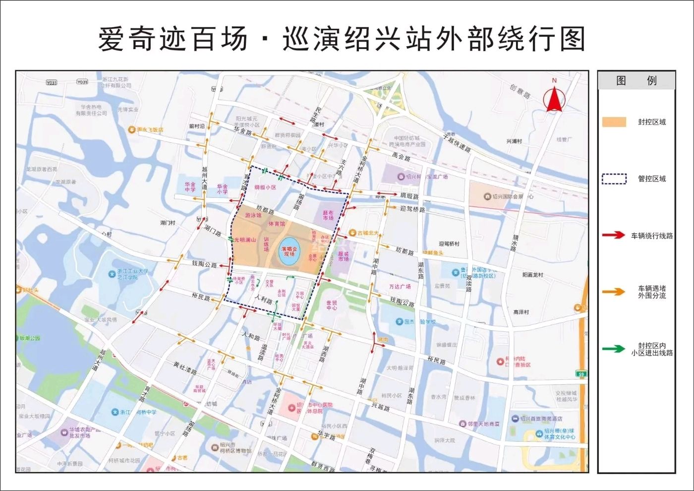 “爱奇迹百场·巡演绍兴站”将于2026年3月7日(周六)19时,在中国轻纺城体育中心体育场举行。为确保本次活动的顺利进行及活动期间交通安全、有序、畅通,根据《中华人民共和国道路交通安全法》第39条之规定,公安机关交通管理部门将对部分道路采取临时交通管制。现通告如下: