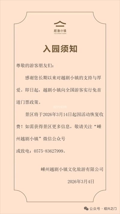 刚刚,嵊州越剧小镇发布公告,即日起,越剧小镇向全国游客实行免首道门票政策。 景区将于2026年3月14日起因活动恢复收 费!如需获得景区更多信息,敬请关注“嵊 州越剧小镇”微信公众号 或致电:0575-83627999。