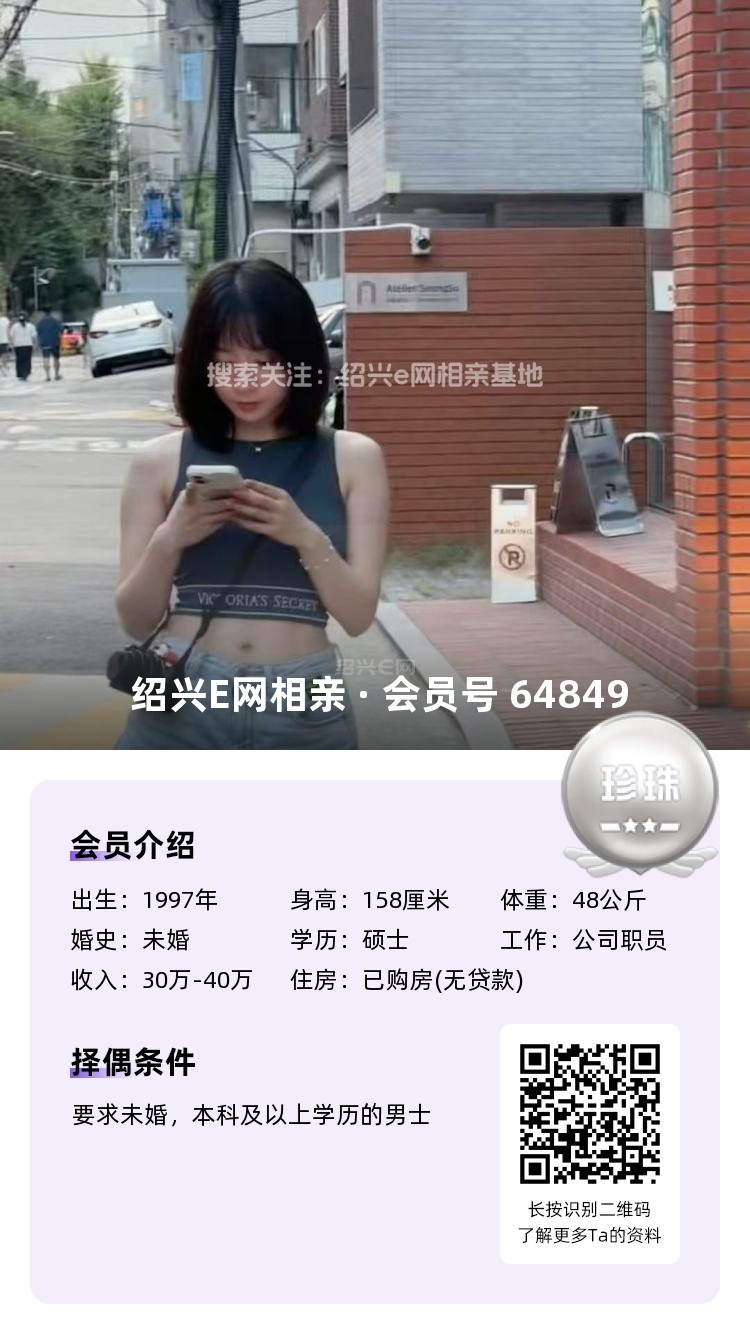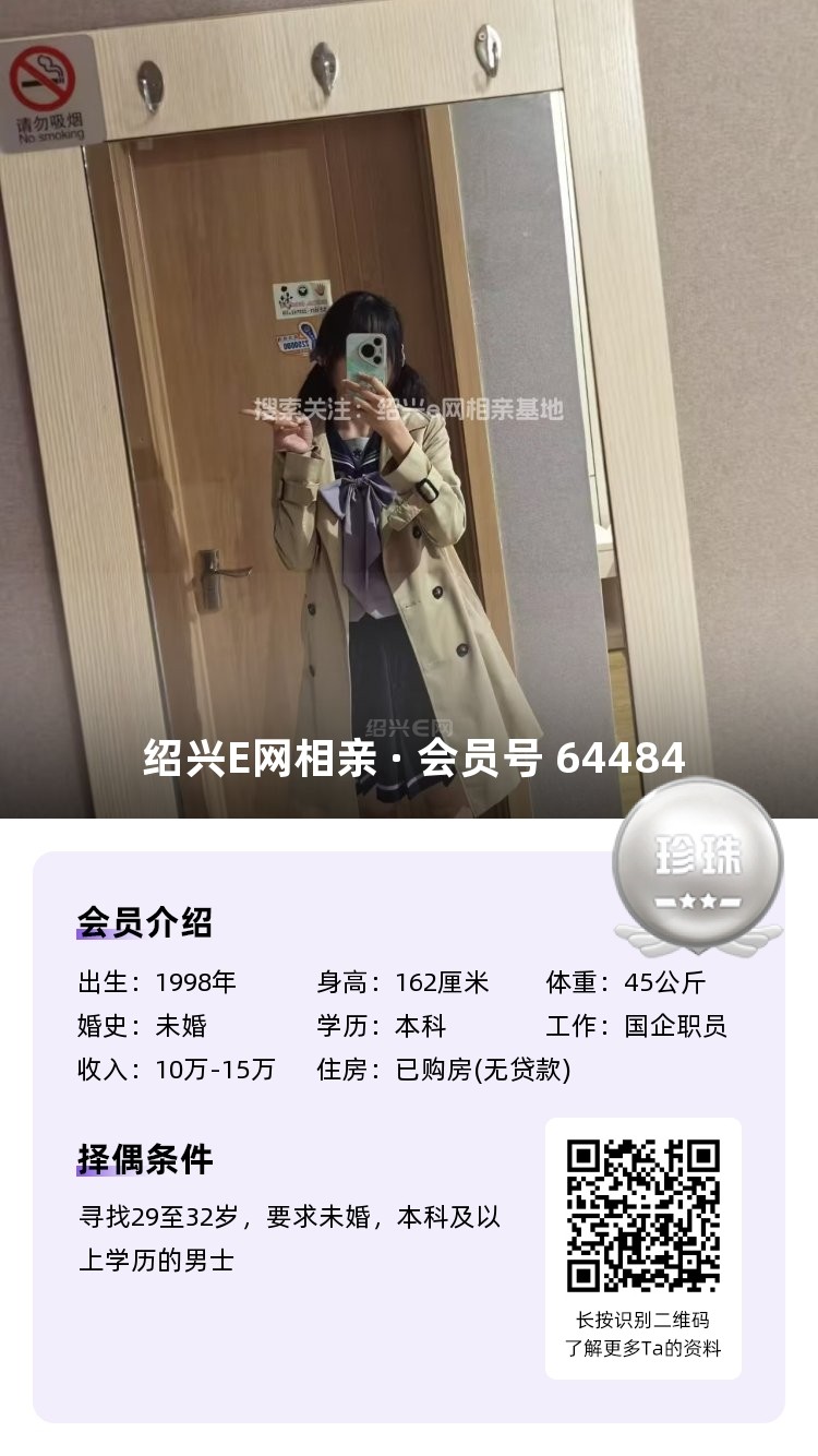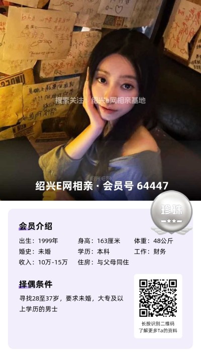 寻觅:33岁以下,身高172+,大专以上,年薪10w+,房车俱备,外貌顺眼、相处舒服的绍兴本地男生。