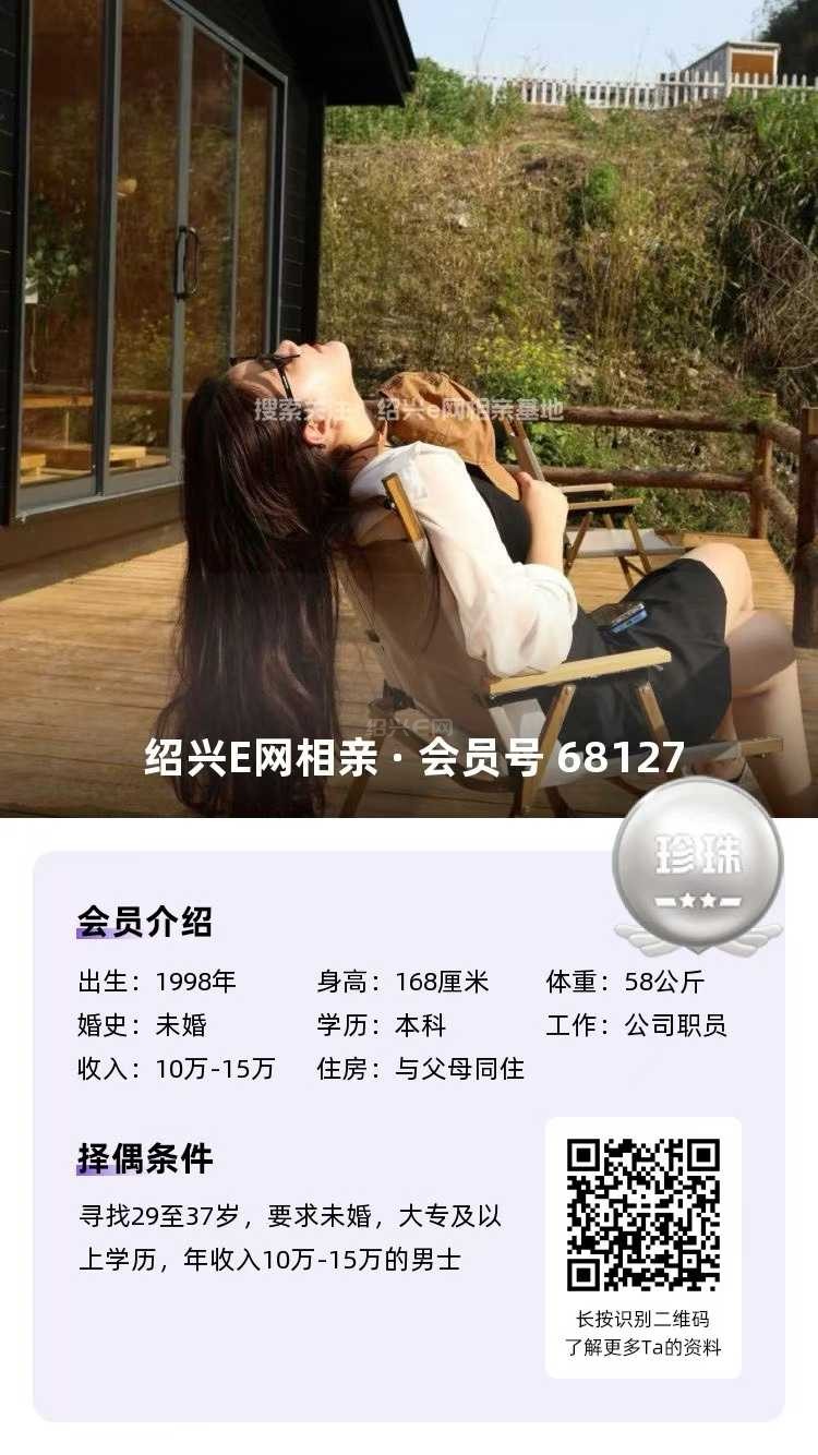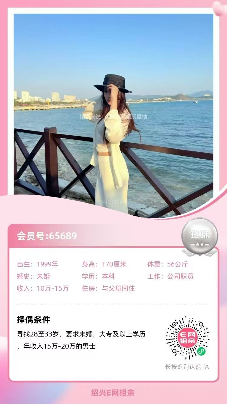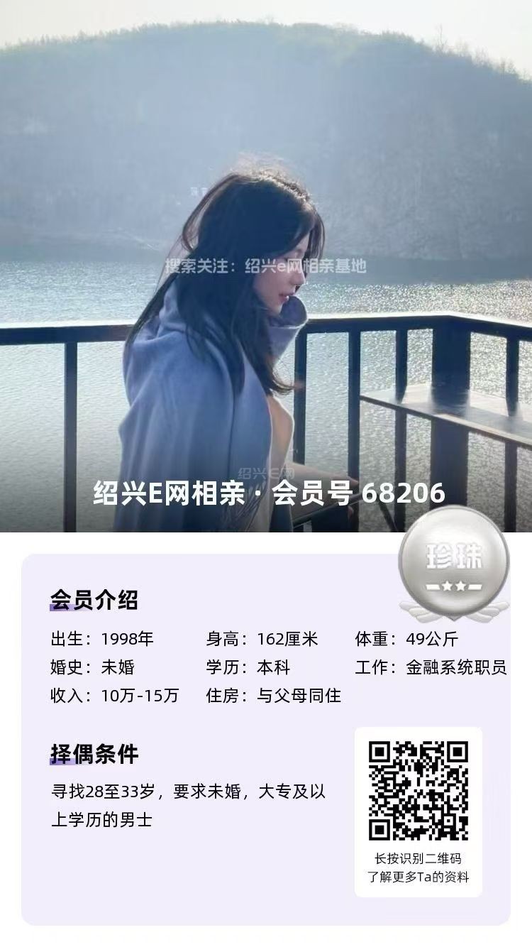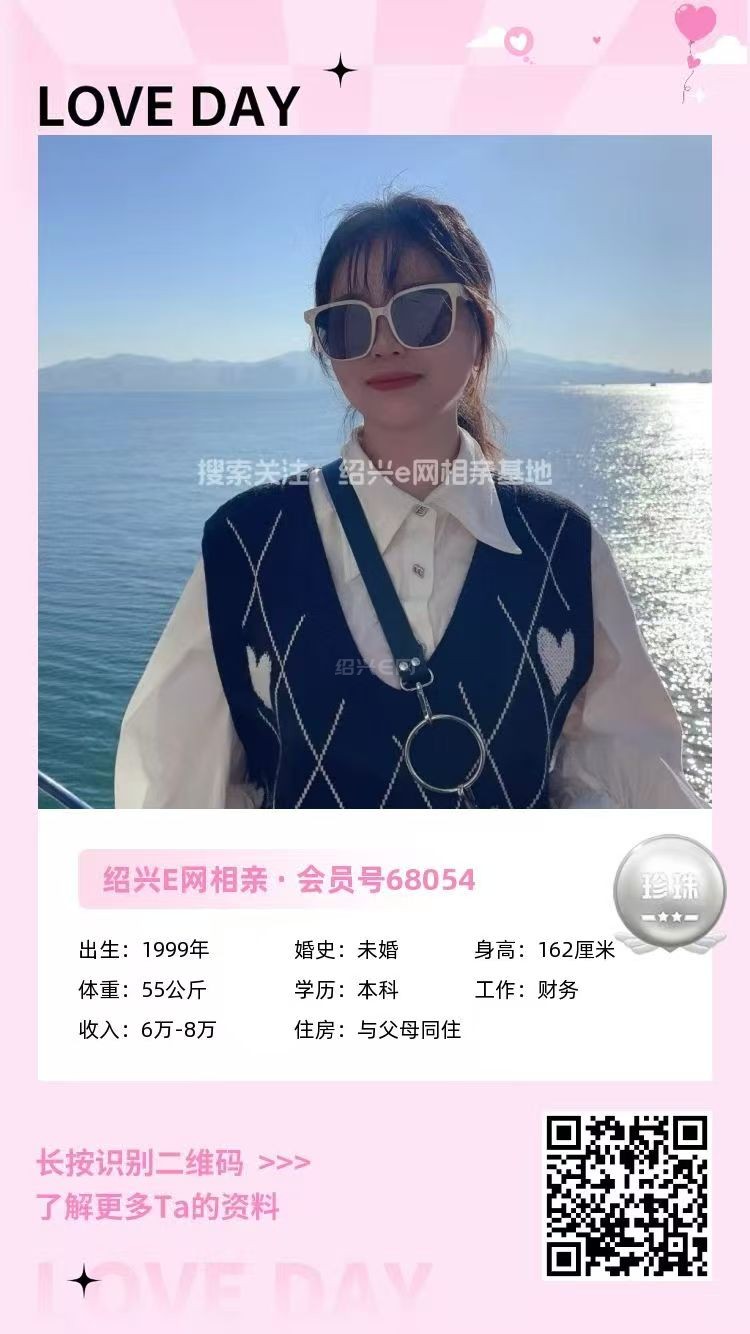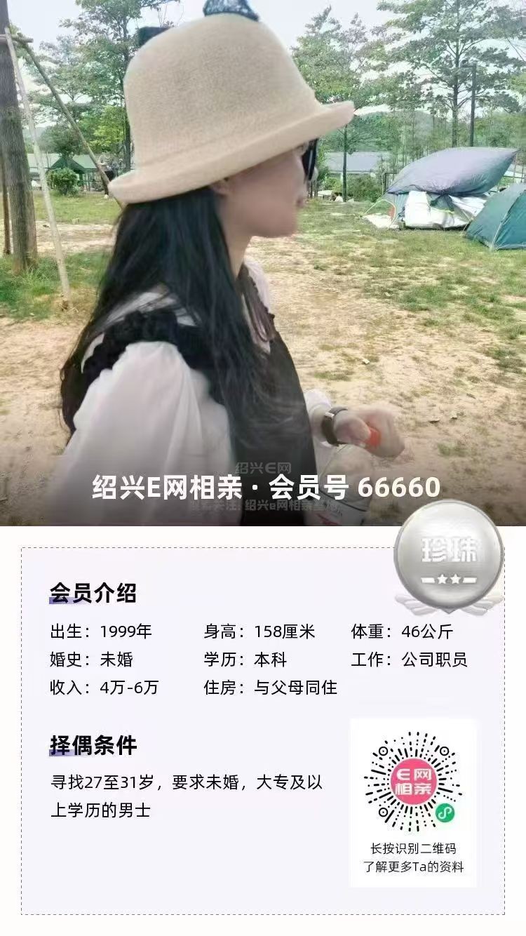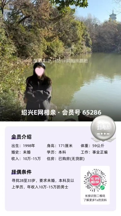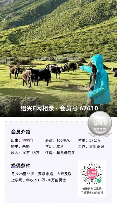 98年未婚,大专毕业,跟父母定居绍兴越城区,目前在杭州工作,从事人事岗位,年薪10万(后期也可以回绍兴工作)