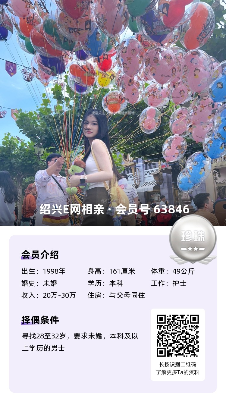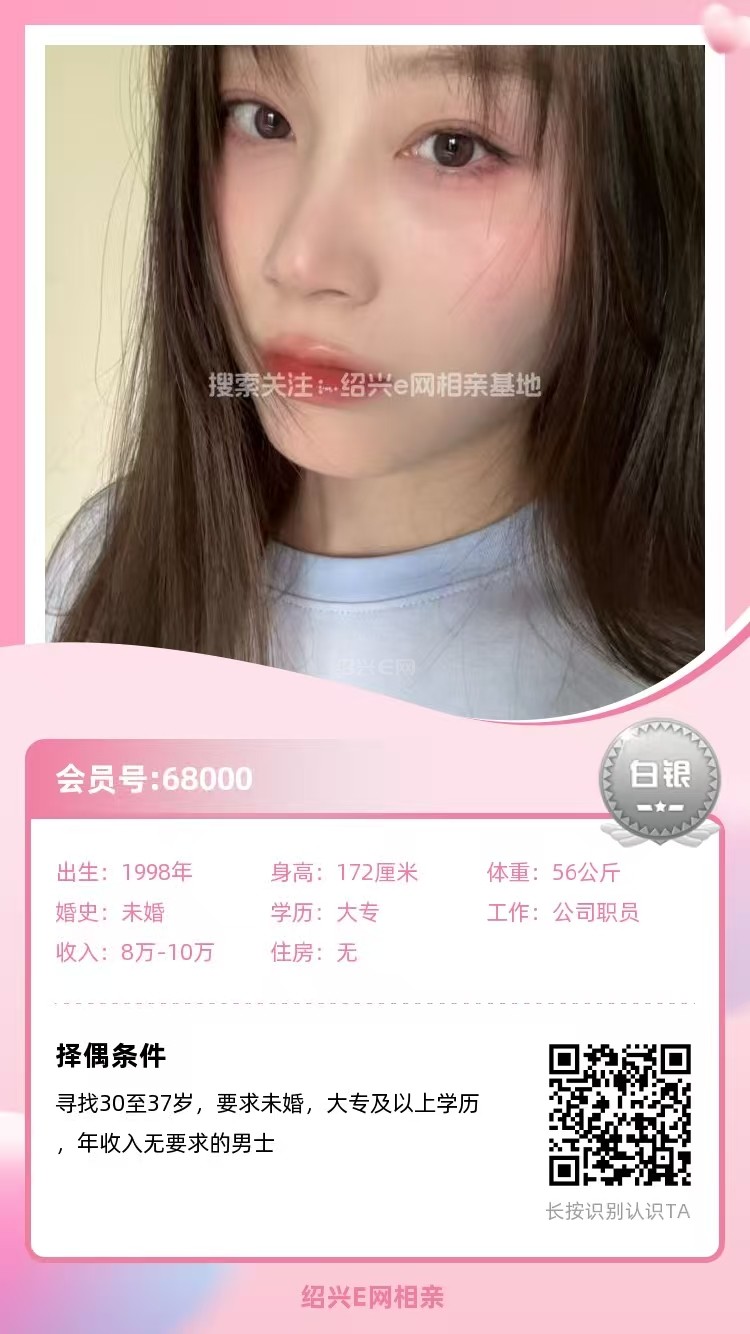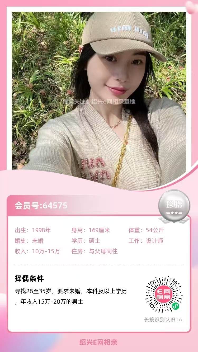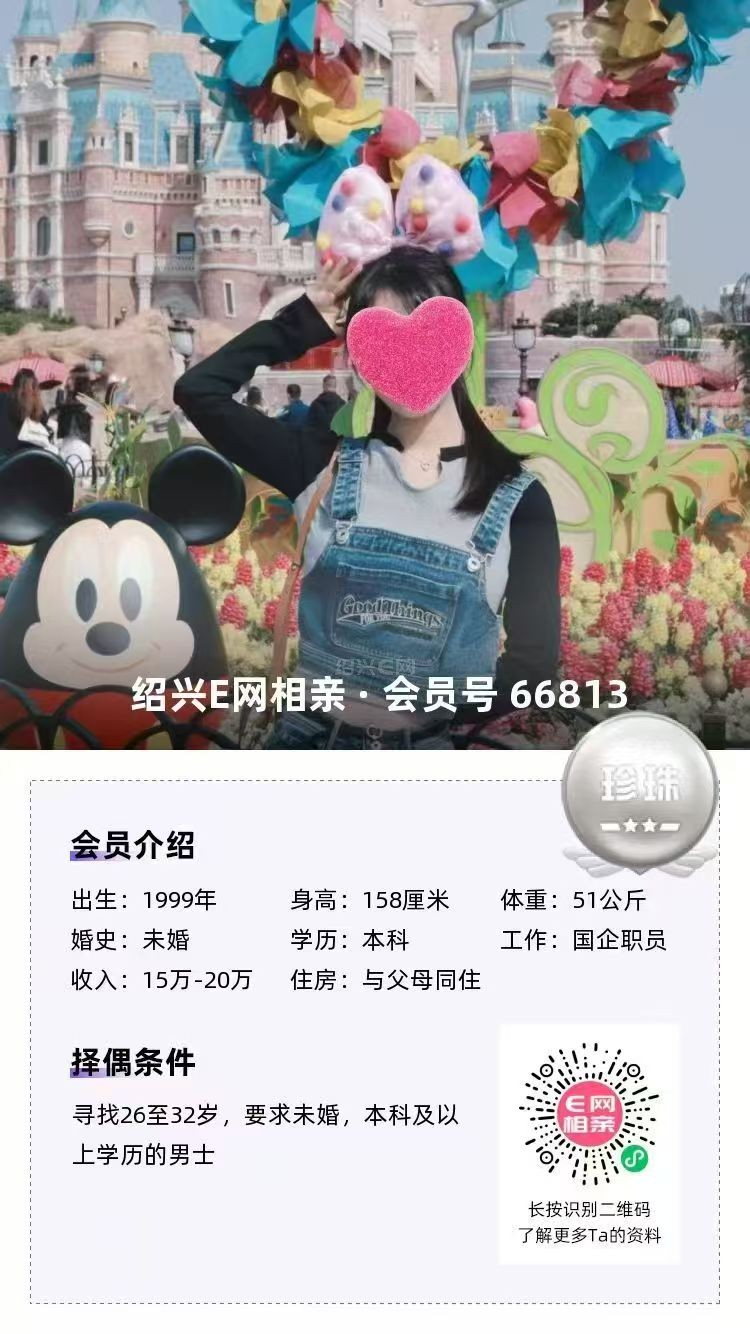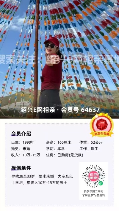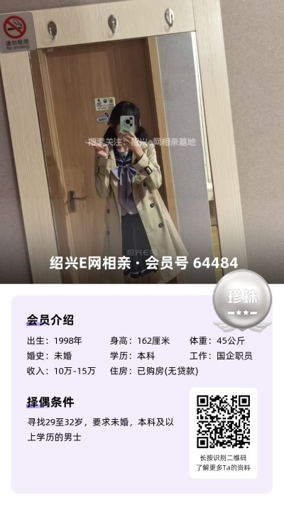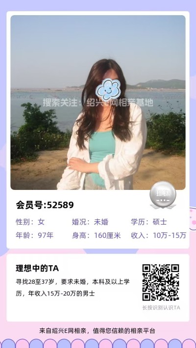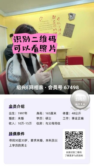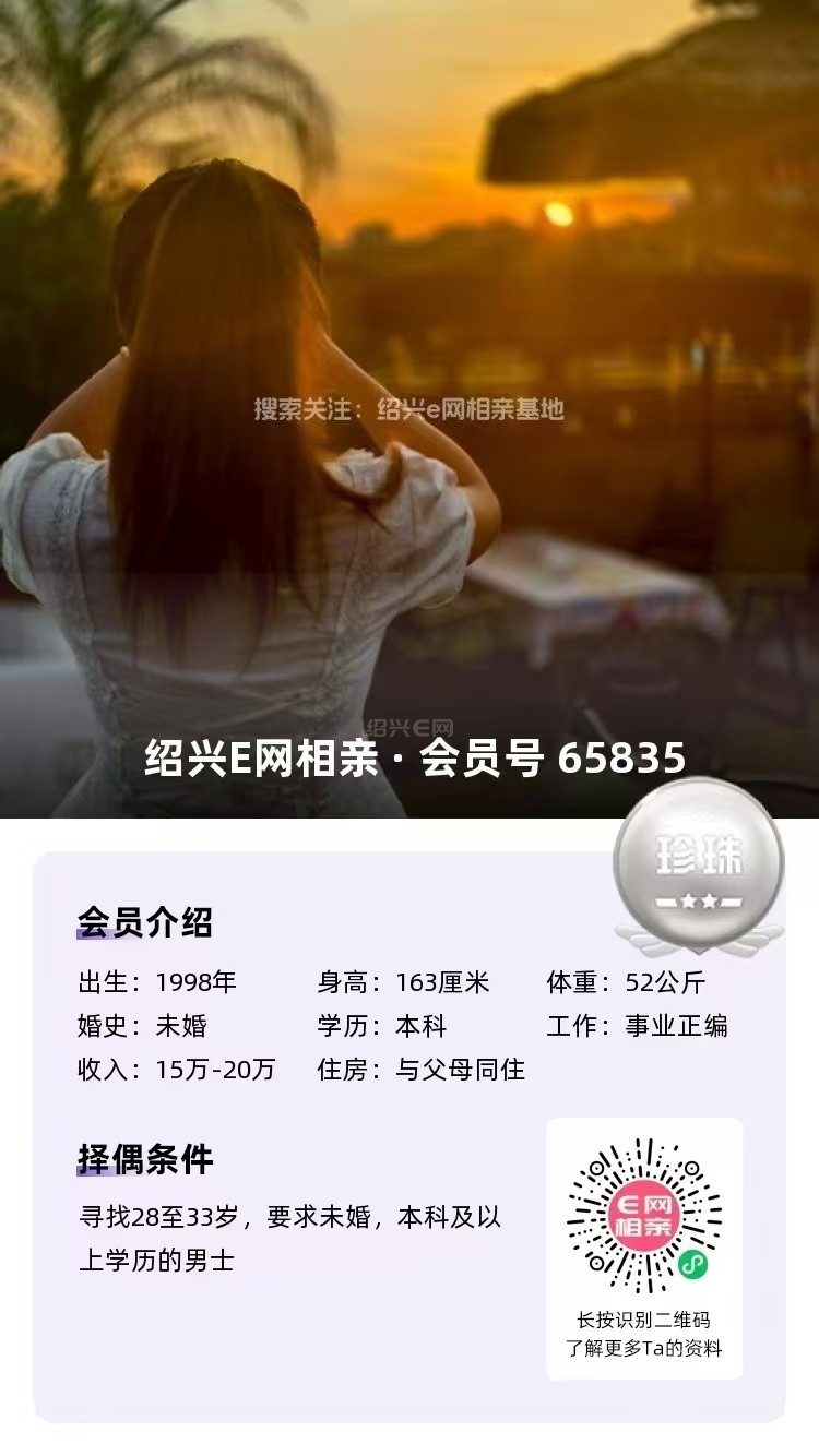 98年未婚,大专毕业,跟父母定居绍兴越城区,目前在杭州工作,从事人事岗位,年薪10万(后期也可以回绍兴工作)
