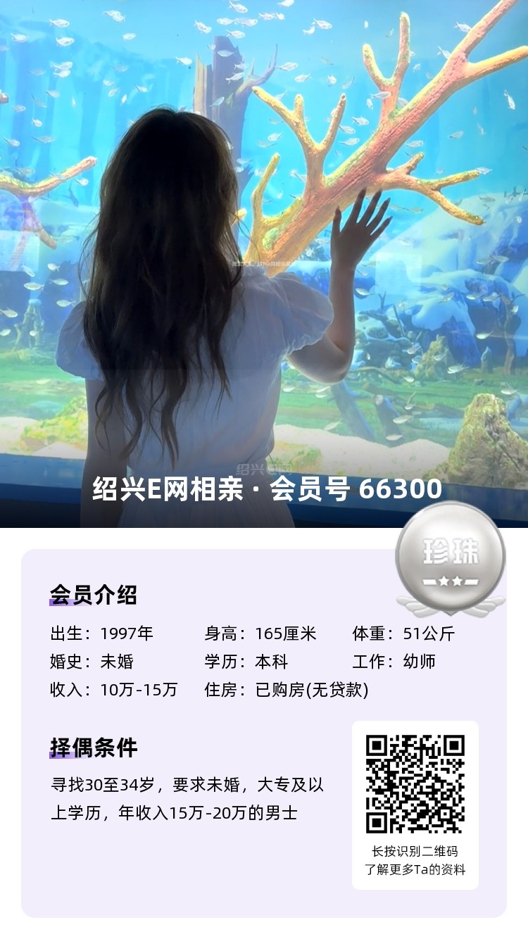 独生女,越城人在杭州工作,幼师,年薪15w左右,名下有房(绍兴)无贷款。