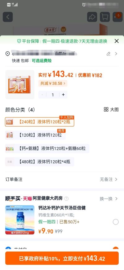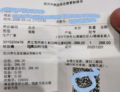 今天去华通医药买了2瓶 养生堂 液体钙片,不进医保,自付288。看完病人后,发现阿里药房同款只要143.42,还享受10%政府补贴。2倍差价,同价格我都可以买4瓶了。怪不得现在实体店倒闭这么多,价格贵得太离谱了