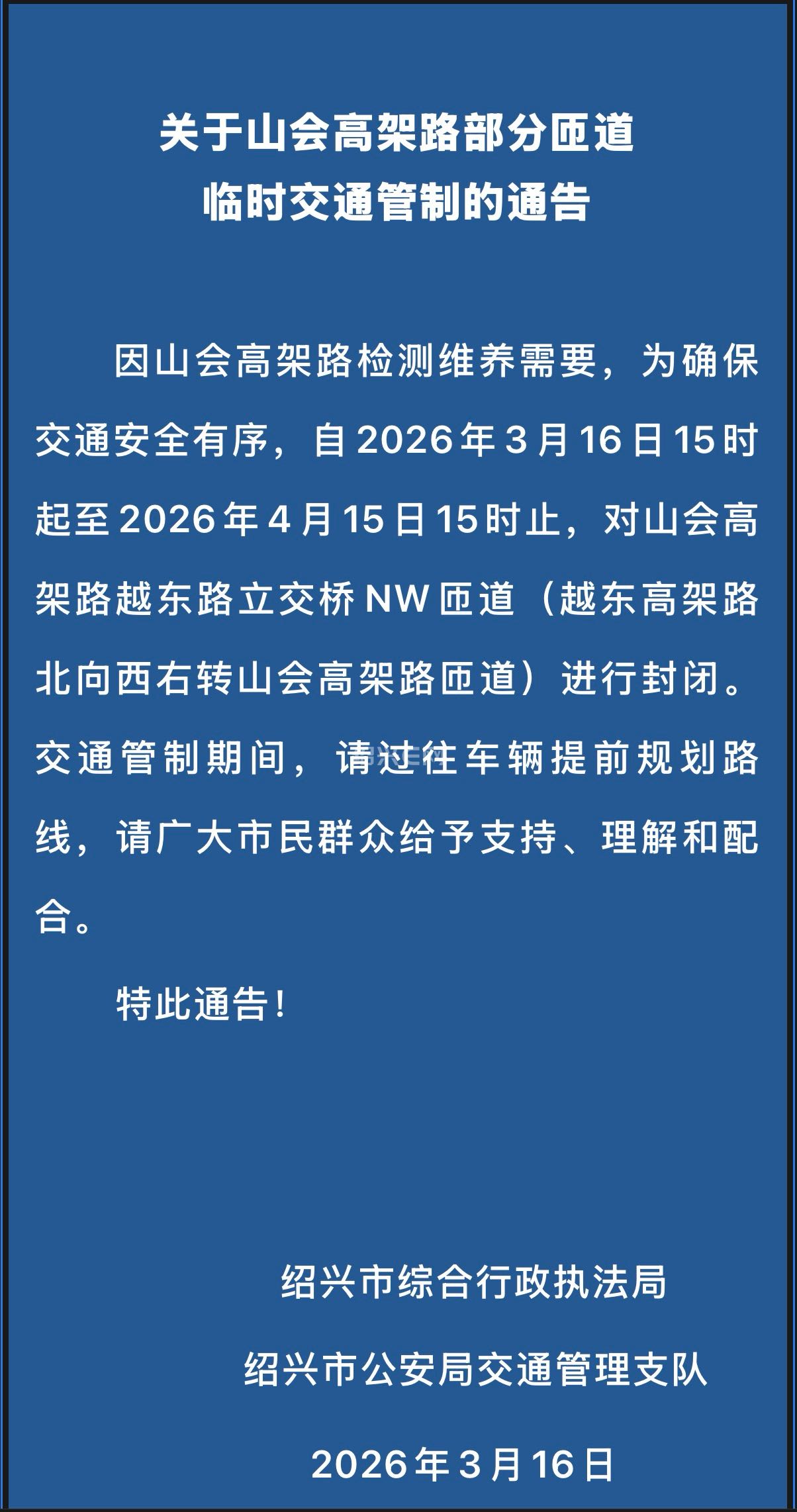 关于山会高架路部分匝道 临时交通管制的通告