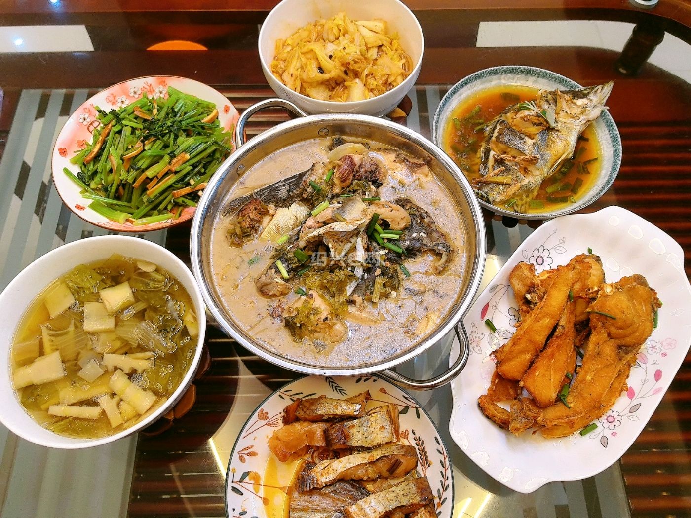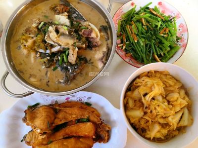 今日晚餐:葱油鳜鱼~油炸酥鱼~咸菜鱼头~鱼干~哈哈