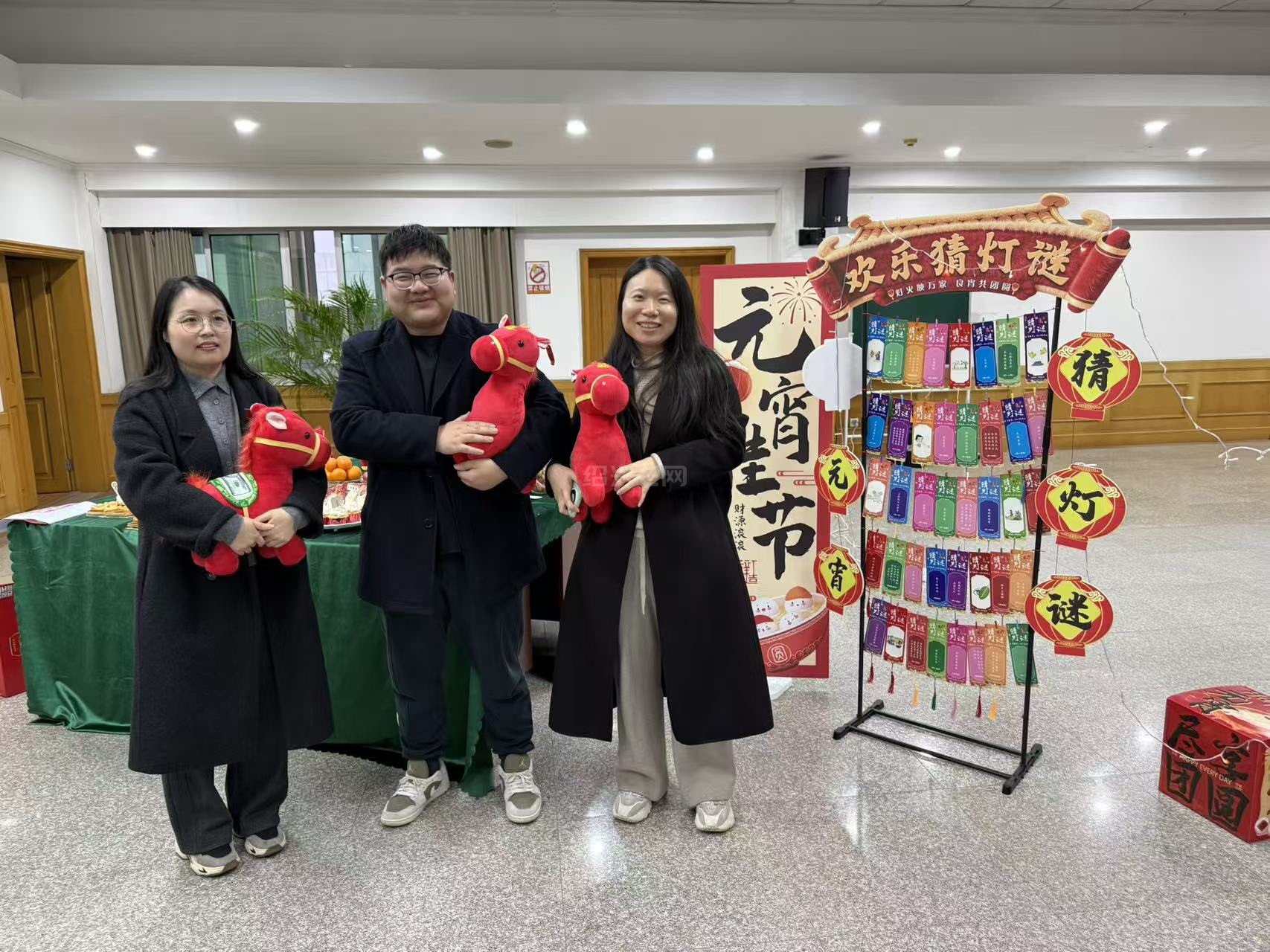 活动现场张灯结彩,“欢乐猜灯谜”区域挂满了色彩缤纷的灯谜条,大家踊跃参与、热烈讨论,在趣味互动中感受传统民俗魅力。茶歇区精心准备了蛋糕、水果、坚果及定制饮品,搭配寓意“马到成功”的红色小马玩偶,让大家在品尝美食的同时,收获满满的节日惊喜。