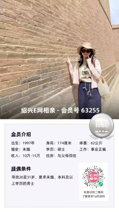寻觅:37岁以下,未婚,身高173+,大专以上,五官端正,年薪10w+,房车俱备,开朗稳重、有主见和责任感的绍兴本地男生。