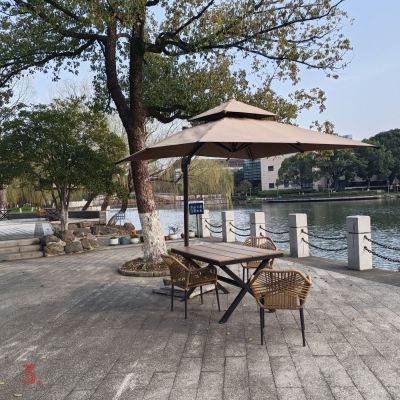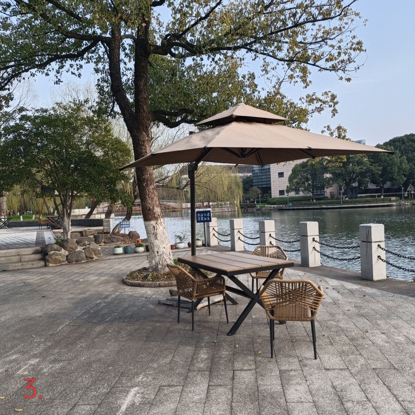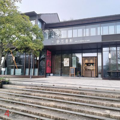 跨越小小石桥,即见一片宽敞的石板地,书轩全貌始入眼帘:四间二层楼房,仅用黑白二色,显得素雅、沉稳、气象端凝,正门额上书“静思书轩”四字。房舍整体面河朝南。道地有露天桌椅三套,旁有遮阳伞,供游人落座小憩,亦可欣赏宽阔的新开河两岸景色,河边岸柳垂翠,春则樱花桃花争艳,秋则玉兰丹桂飘香。对岸美术館,博物館高楼宏伟,多幢小区民宅,隐于绿化带后。立于静思轩前,环视周边环境,幽静雅致,清气袭人,令人心旷神 怡。