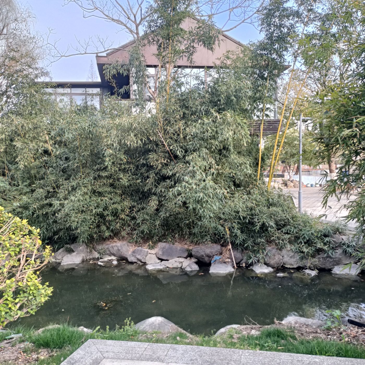 自柯桥轻纺城地铁站东行,沿步道百余米,于东南隅拐角,有屋舍隐于翠竹密林间。观路牌,知此处为“静思书轩”。书轩偏居公园之一角,又四面临水,为林木修竹所蔽,鲜为人知。其北有平板桥可通其后,南有石桥达其前。石桥小巧精致,横卧于较河为窄之大溪上。溪畔随形块石叠为岸,天然成趣,溪水澄澄,草木葱茏。
