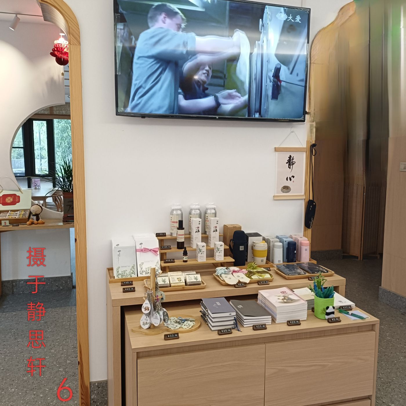步入书轩屋内,入门三四步有一屏壁,屏壁前置一桌,放有兰花、及一众书籍,格调雅致,清香与墨香四溢。周边还陈列有一些口杯、笔记本等生活学习用品,另有类似核桃山药粉、黑芝麻红豆粉等点心类食品出售。值班的管理员美女态度热情,语音甜美,她介绍说,这处“静思书轩”是一位胸怀善心、热心公益的企业家,从企业经营收益中分出部分资金投入公益,以此为据点在社会上开展爱心公益活动。