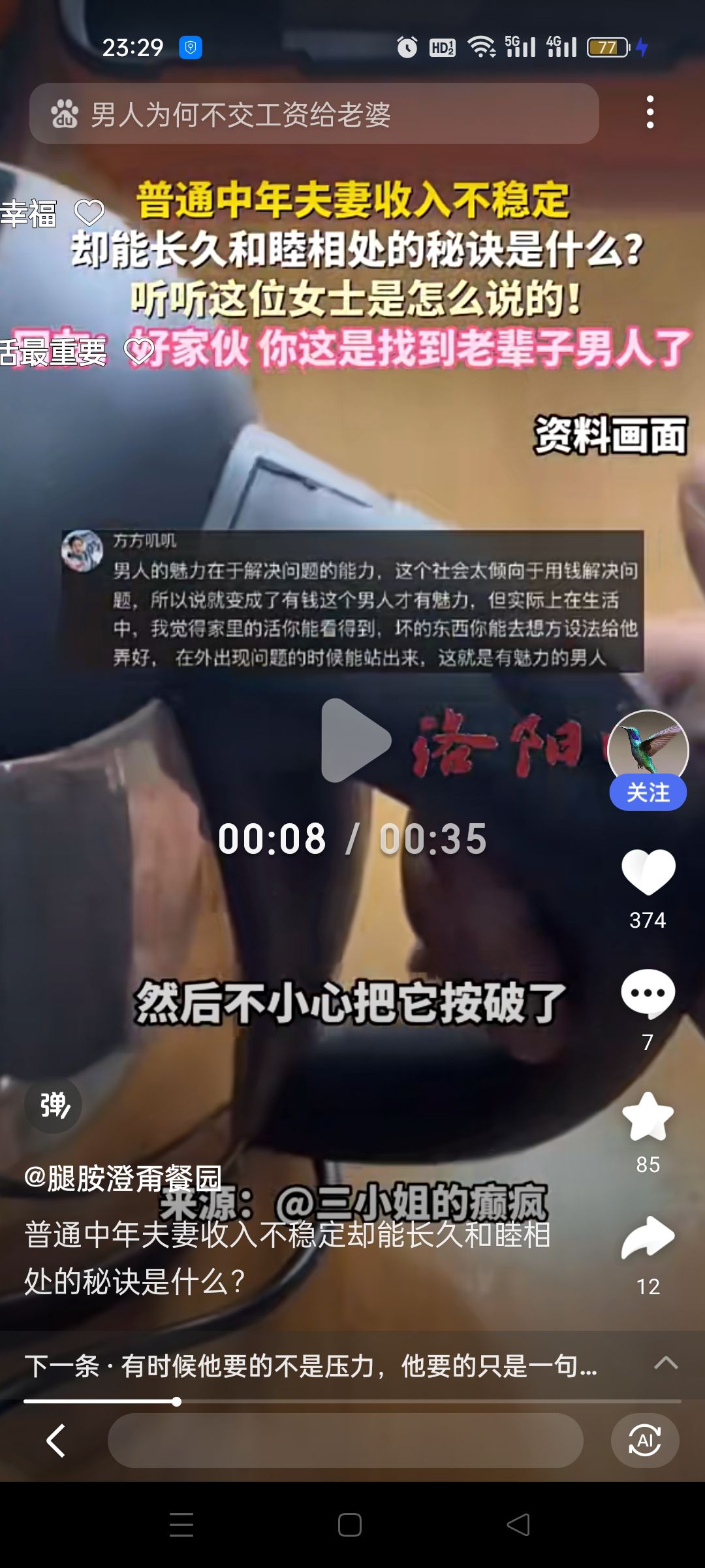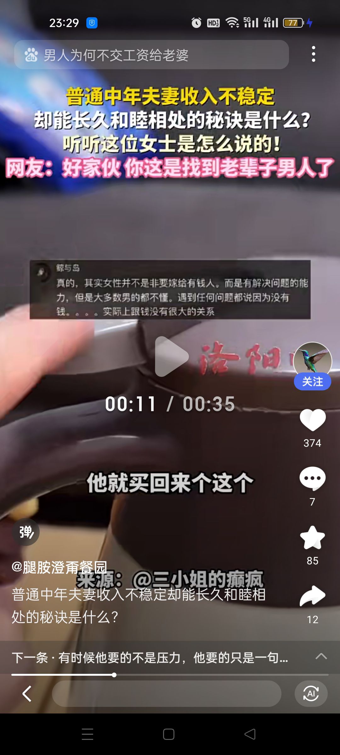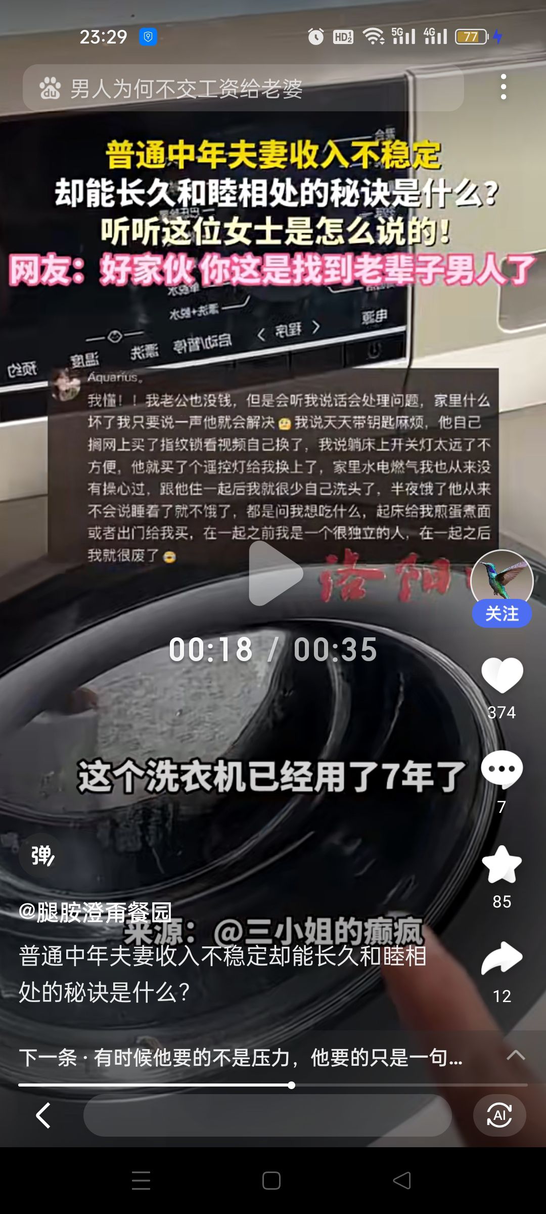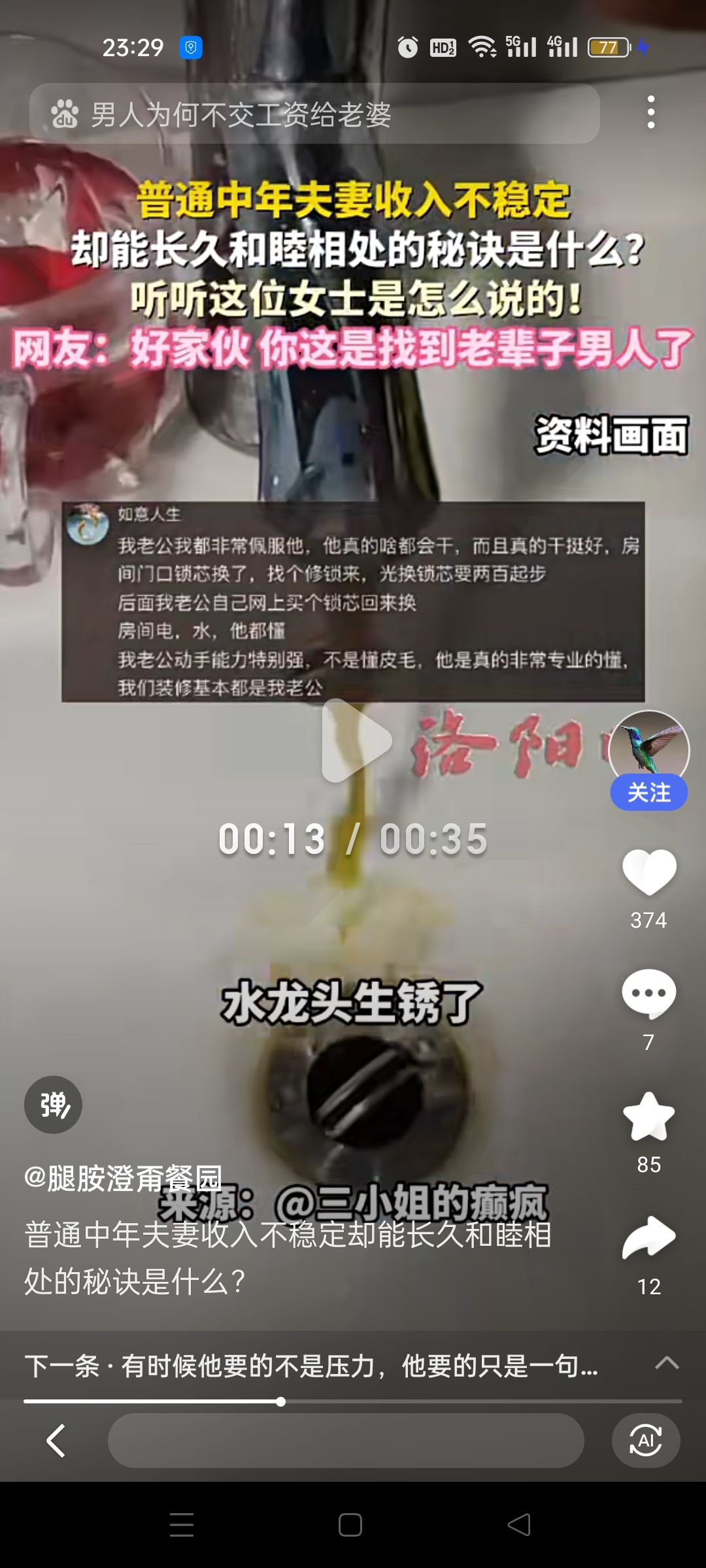 有感于今天刷到的一个视频,上面有一个中年女士在网上说,她们夫妻多年虽然没有多少钱,但她一直感到很幸福的原因。