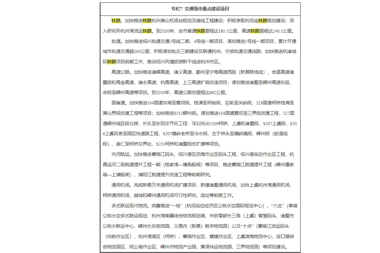 加快推进绍兴轨道交通2号线二期、4号线一期项目,谋划推进5号线一期项目,累计开通城市轨道交通超100公里,积极谋划轨交三期建设及联通杭州、宁波轨道交通线路