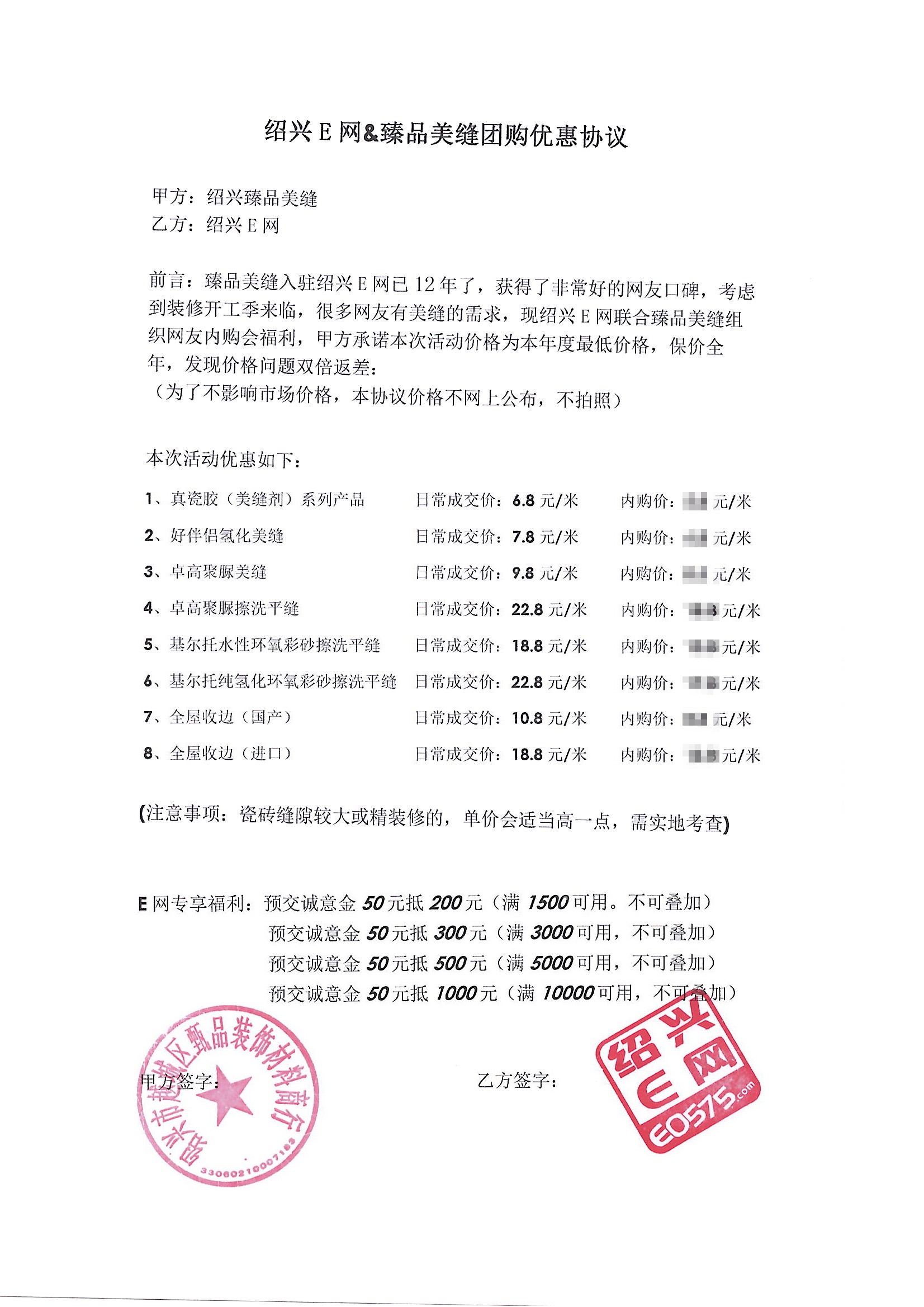 前言:臻品美缝入驻绍兴E网已12年了,获得了非常好的网友口碑,考虑到装修开工季来临,很多网友有美缝的需求,现绍兴E网联合臻品美缝组织网友12周年内购会福利,甲方承诺本次活动价格为本年度最低价格,保价全年,发现价格问题双倍返差!
