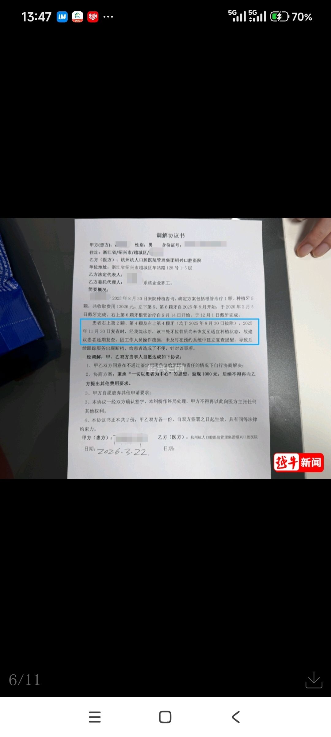 在调解书中,越牛新闻记者看到了“曾在11月30日复查时,提到患者后三处牙齿未达到种植状态,并建议延期复查”的表述,而后也承认在后续追踪服务上出现了“断档”,给患者造成了不便。