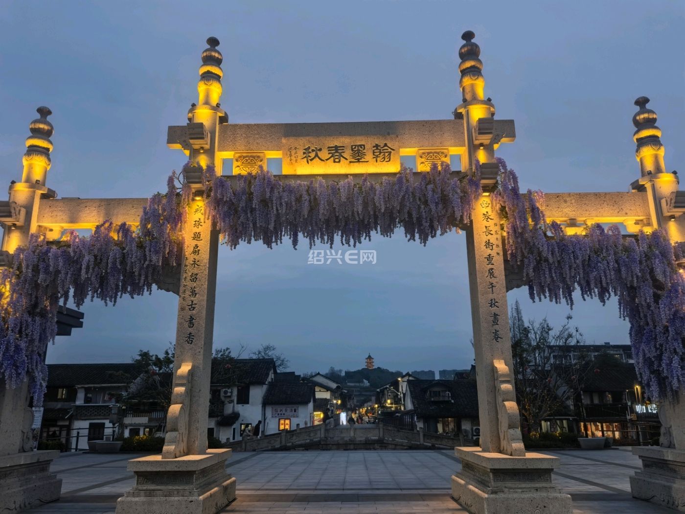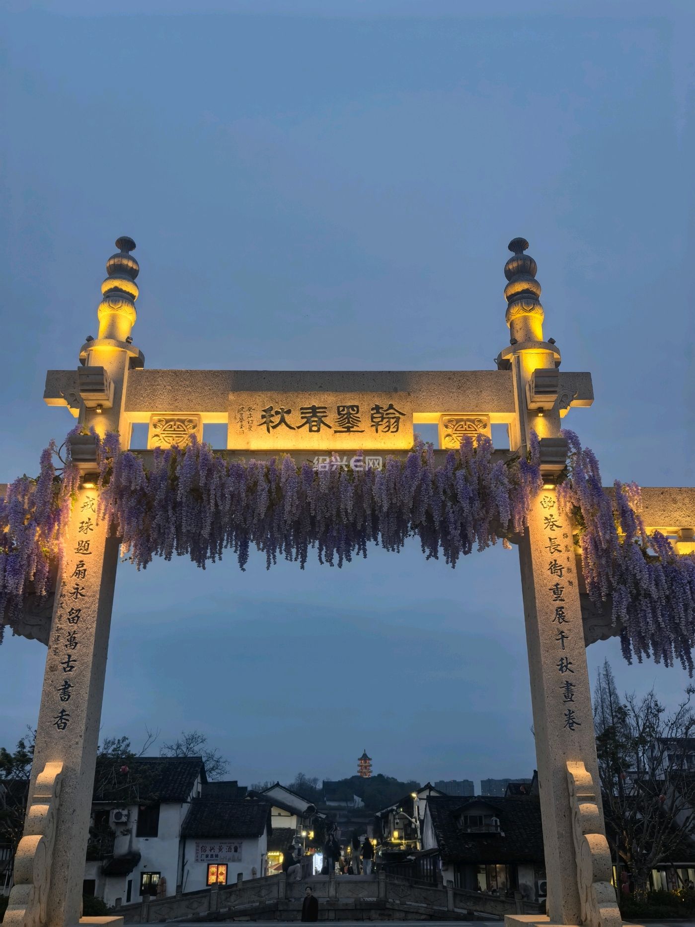大门牌坊装饰了紫藤花,很有春日氛围,