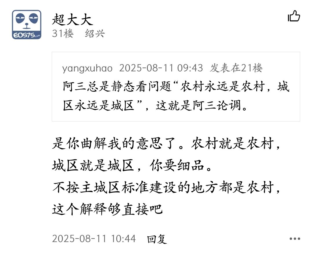 那你可以反驳一下他吗,他可说“农村就是农村,城区就是城区”诶,可不存在你说的“乡镇转变过来的市区”哦