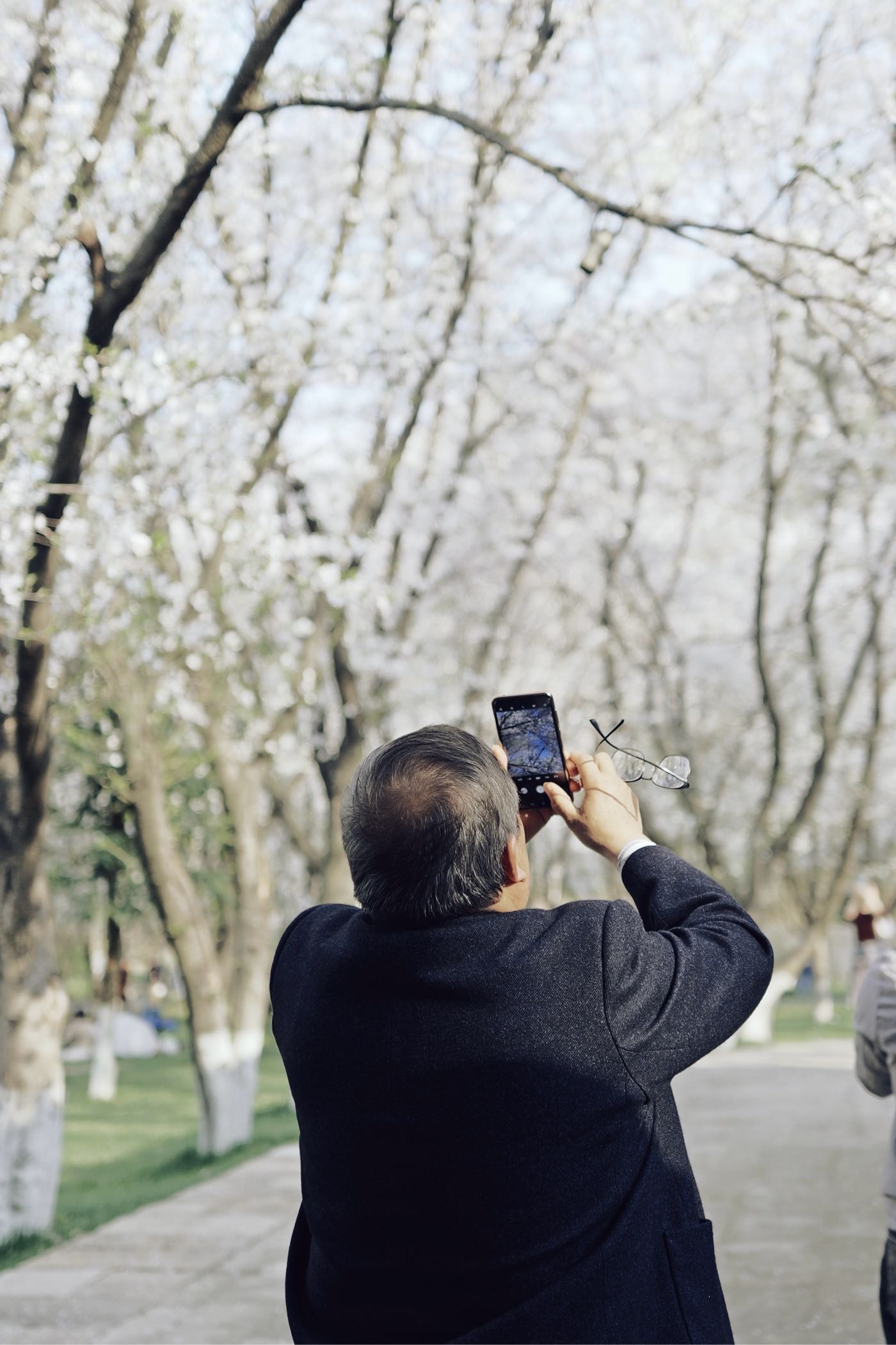 老伯举手机拍春光的专注,