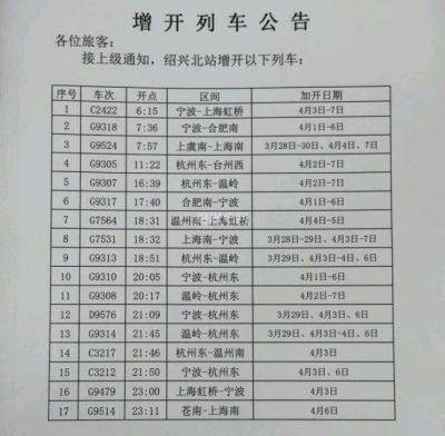 绍兴中小学首个春假与清明假期无缝衔接,让大家有了更充裕的出游时间。为缓解运输压力,铁路部门动态增加了临时运力,绍兴北站近期将增开17趟列车,重点覆盖短途春游和返乡祭扫热门目的地。其中,G9318(宁波—合肥南)、G9310(宁波—杭州东)等车次将在4月1日—6日运行;G9524(上虞南—上海南)、G7564(温州南—上海虹桥)等车次,重点服务前往上海、苏南地区的游客,将在清明假期的高峰时段加密开行;另外还有G9305(杭州东—台州西)、G9307(杭州东—温岭)等车次,为前往浙东南沿海景区的市民提供更多选择。