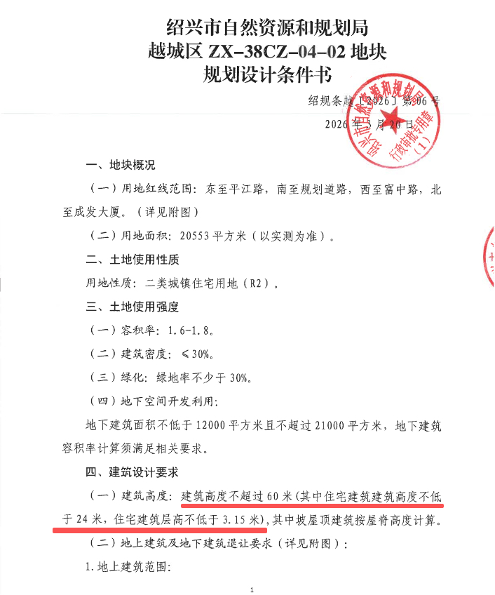 根据规划,该地块限高60米,住宅部分不低于24米,建筑层高不低于3.15米。