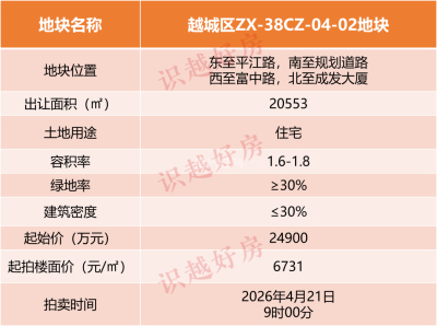 2026越城首拍!迪荡平江路宅地,起拍价6731元/㎡,4.21出让