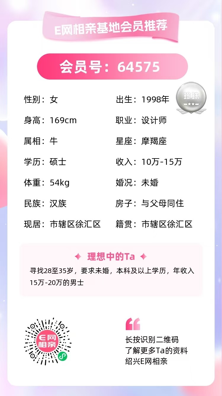 绍兴人在上海工作,独生女,硕士学历,设计师,年薪10-15万。