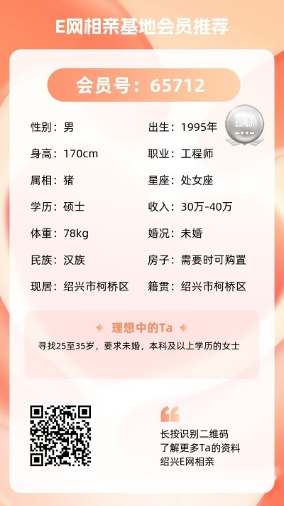 未婚,柯桥人独生子,品学兼优,正直热情,阳光开朗,有干劲与责任心;