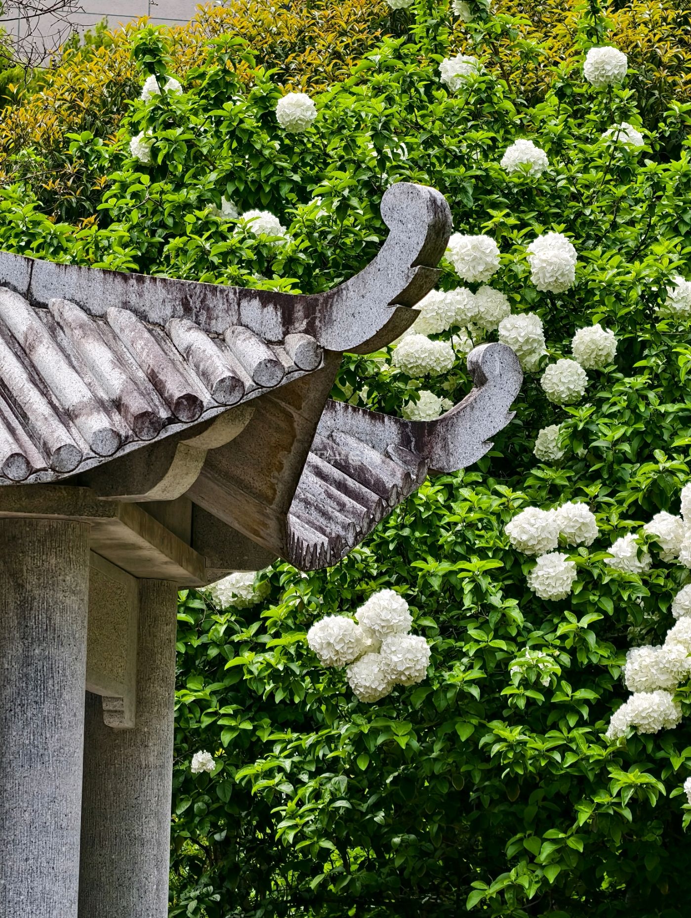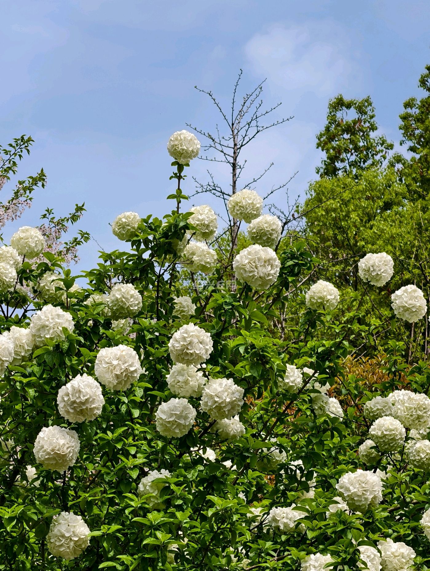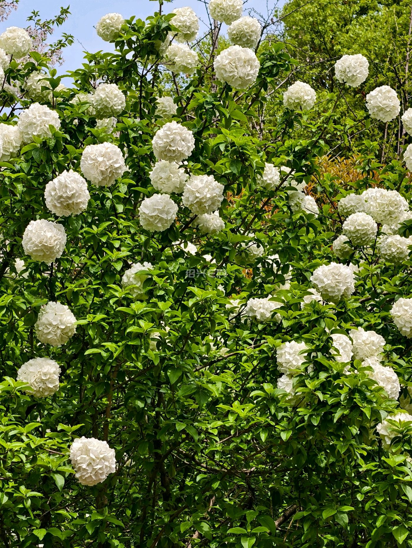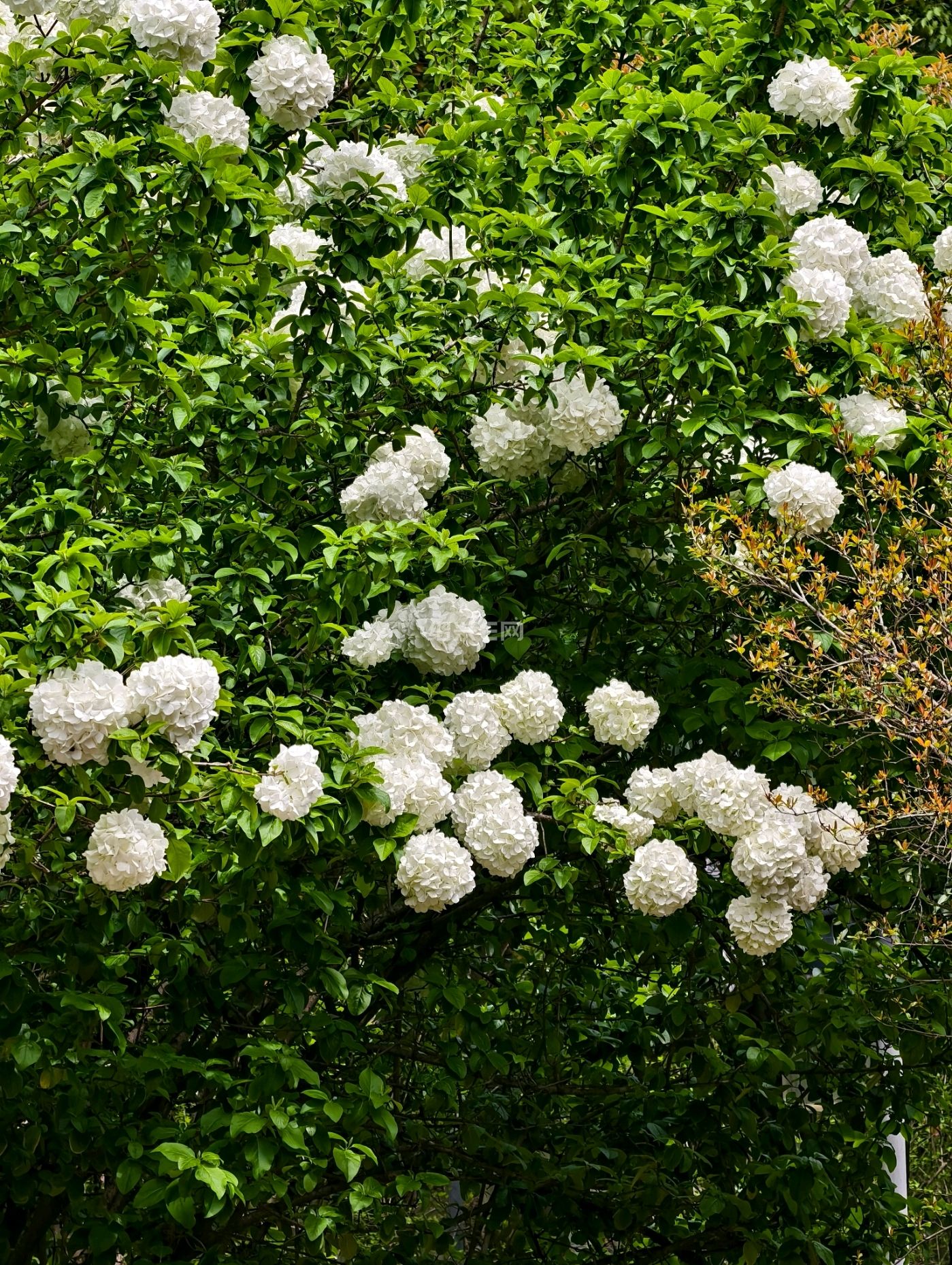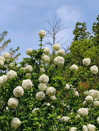 走进西施山公园只见一球球的绣球花开了,绿色的树叶衬托这白色绣球花非常漂亮