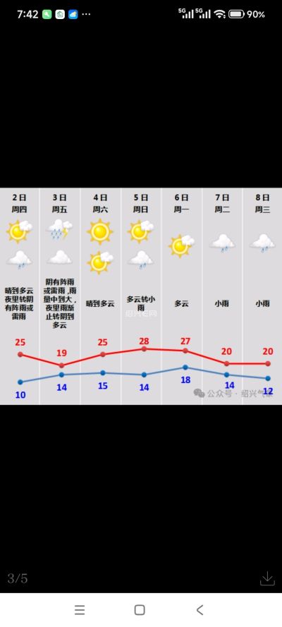 不过晴暖天气并不会一直持续,7日至8日绍兴将再次迎来降雨,小雨上线的同时,气温也会明显回落,最高气温将跌至20℃上下,体感再度转凉。