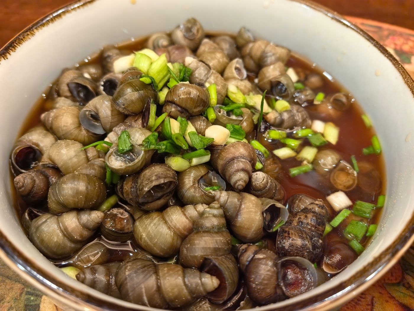 我习惯螺蛳炒着吃。从网上学了一招:先将螺蛳放入沸水中过一下,去掉大部分的“螺盖”,再下锅爆炒:生姜、大蒜头、黄酒、酱油,加适量的甜面酱,出锅之前撒上一些葱段。昨晚有了一点小“创意”:高压锅里刚刚蒸好酱鸭,碗中有不少沉淀下来的酱鸭卤,便顺手用调羹将酱鸭卤淋到了螺蛳上面,果然有了特别鲜美的味道。