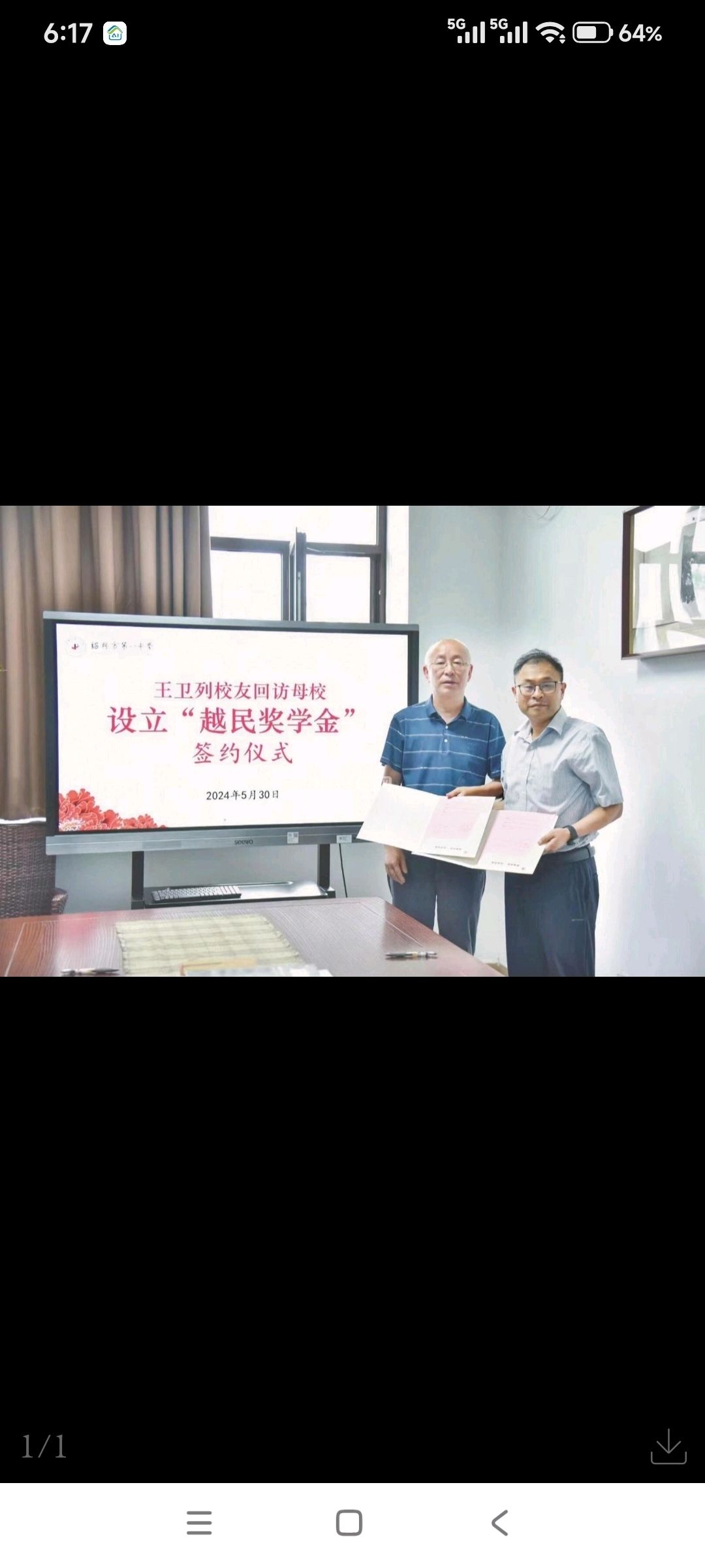 王卫列说,父亲从事教育工作45年,2024年正值父亲百岁诞辰,他希望通过设立“越民奖学金”,作为一份特别的纪念,让父亲的名字和精神长久地留在家乡的校园里。