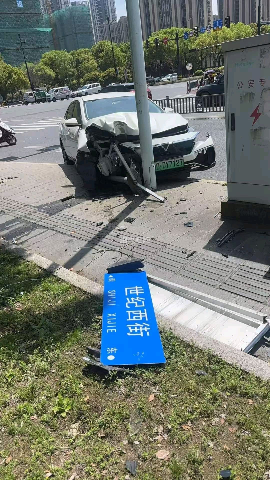 一辆电车撞电线杆子,车头严重变形,路牌掉落地上