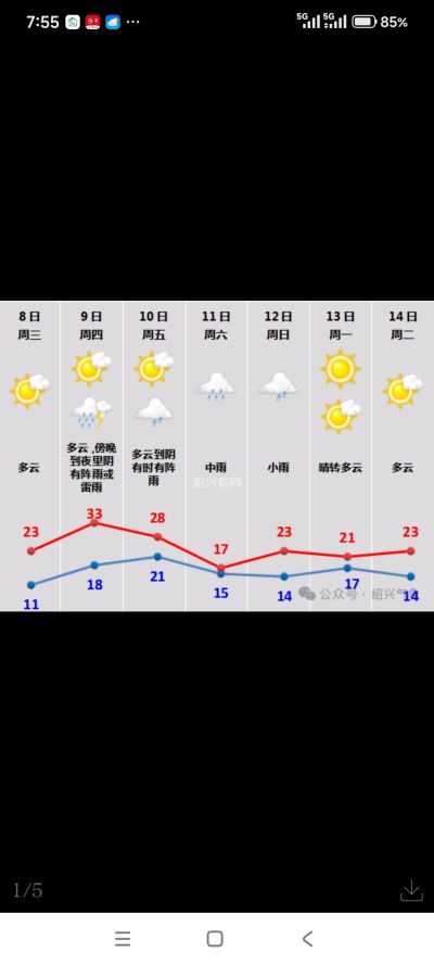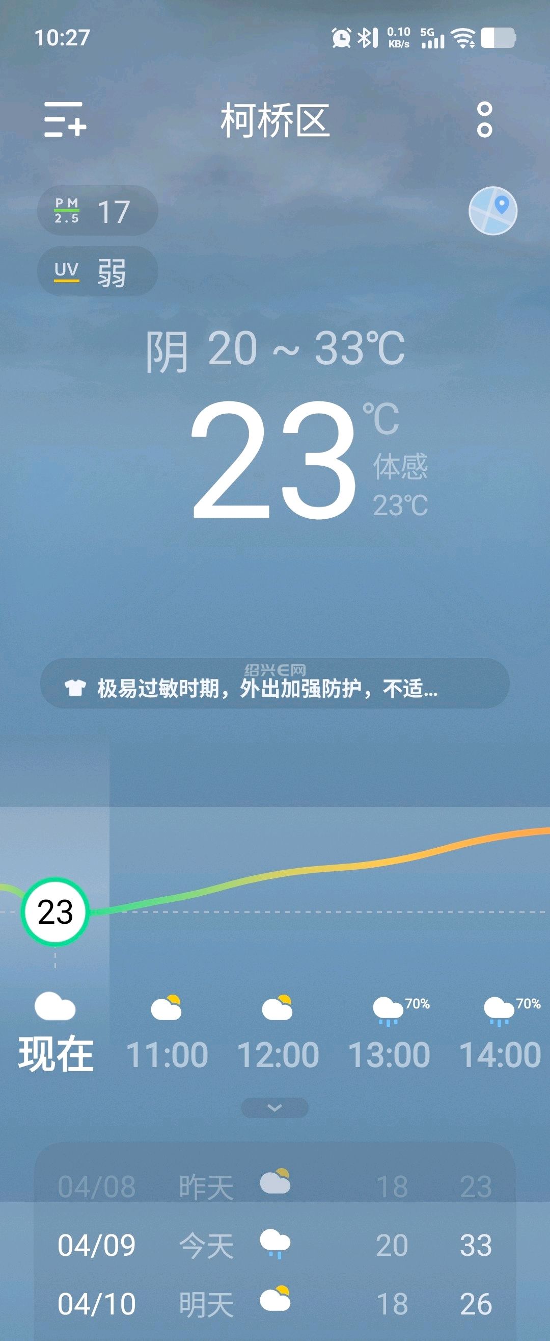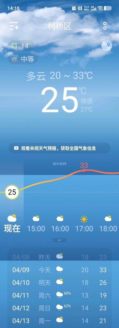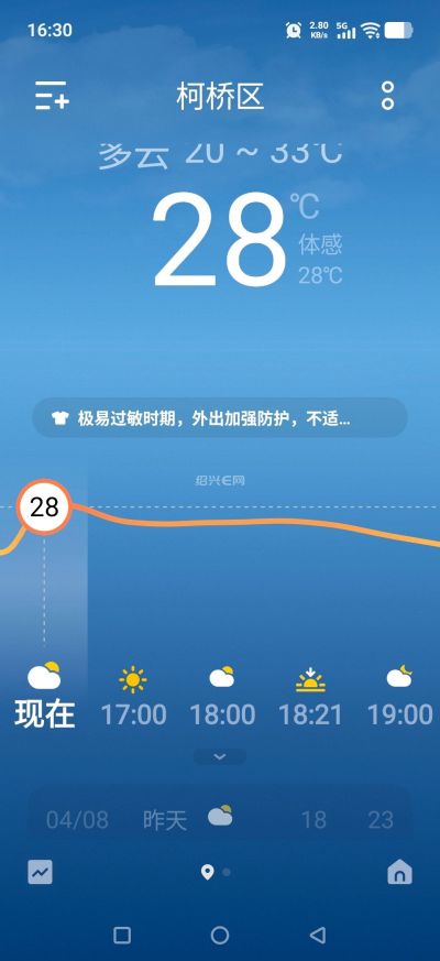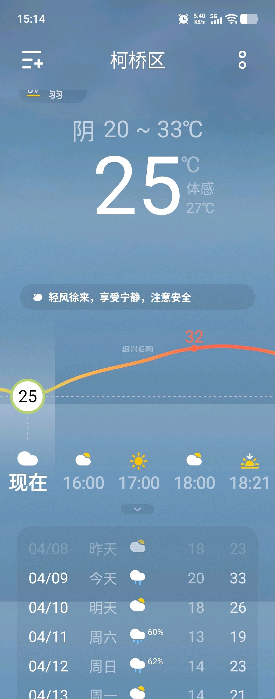 绍兴市气象台2026年4月9日6:00发布的短期天气预报:今天多云,傍晚到夜里阴有阵雨或雷雨,明天多云到阴有时有阵雨 。西南风3~4级阵风5~7级个别8级。今天最高气温:31~32℃,比昨天偏高10℃左右。明天最低气温:21~23℃,比今天偏高3℃左右。后天中雨15~17℃。