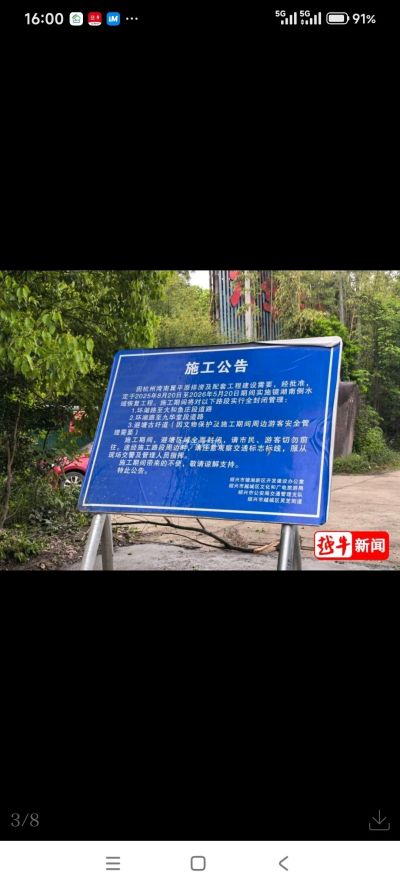 在犭央犭茶湖避塘入口处,一份醒目的施工公告格外显眼。公告显示,施工时间为2025年8月20日至2026年5月20日,实施的是镜湖南侧水域恢复工程。施工期间避塘区域将全面封闭,提醒广大市民、游客切勿前往该区域。