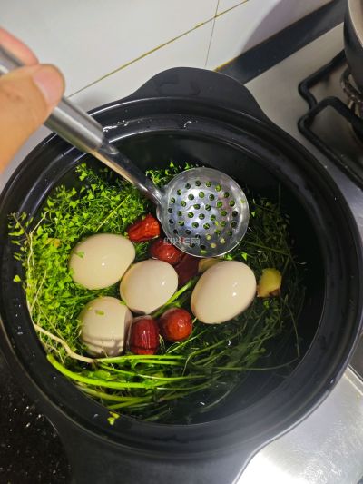 鸡蛋要先煮到半熟,敲出细密的裂纹,再放进汤里慢煮,让荠菜和红枣的香气慢慢渗进蛋壳里。