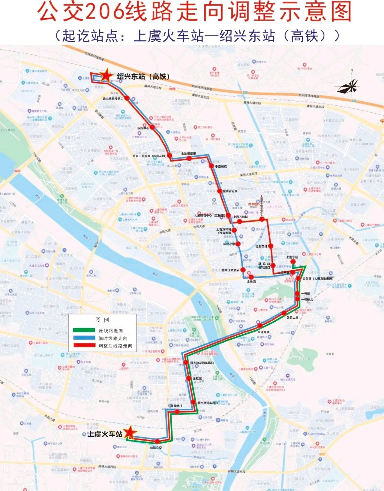 上虞火车站—永和大道—舜江西路—越秀东路—舜杰路—人民大道—凤山路—舜江东路—上虞东站。