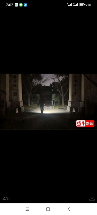 记者:现在是晚上的7点半,我现在是在柯桥区的太平桥公园,我们可以看到整个公园的路灯全部都是不亮的,如果没有手电的照射,整个公园可以说是漆黑一片,伸手不见五指。