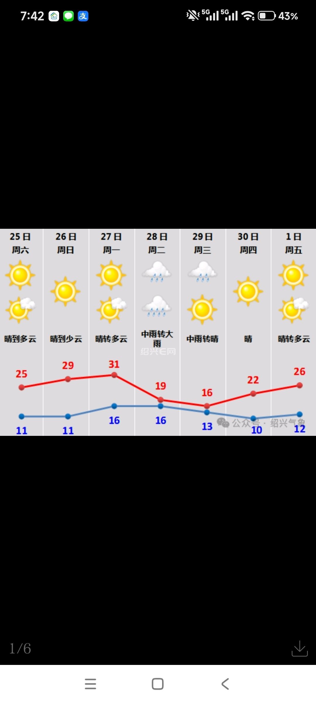绍兴市气象台2026年4月26日6:00发布的短期天气预报:今天晴到少云,明天晴到多云。偏南风2~3级。今天最高气温:28~29℃,比昨天偏高3℃左右。明天最低气温:15~17℃,比今天偏高2℃左右。后天阴有中到大雨16~19℃。