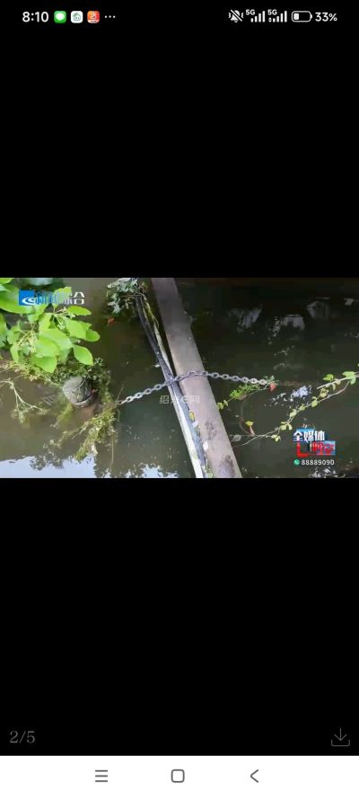 记者在绍兴市越城区解放南路望花小区河道现场看到,一个石柱因底部断裂发生倾倒,全靠连接的铁链拉扯才未完全落水,呈现出“摇摇欲坠”的姿态。顺着铁链仔细观察,情况更为触目惊心。原来除了这根扯在半空中的石柱之外,此前已有多根石柱掉入河道,浸在水里的铁链布满深褐色锈斑,看起来时日已久。