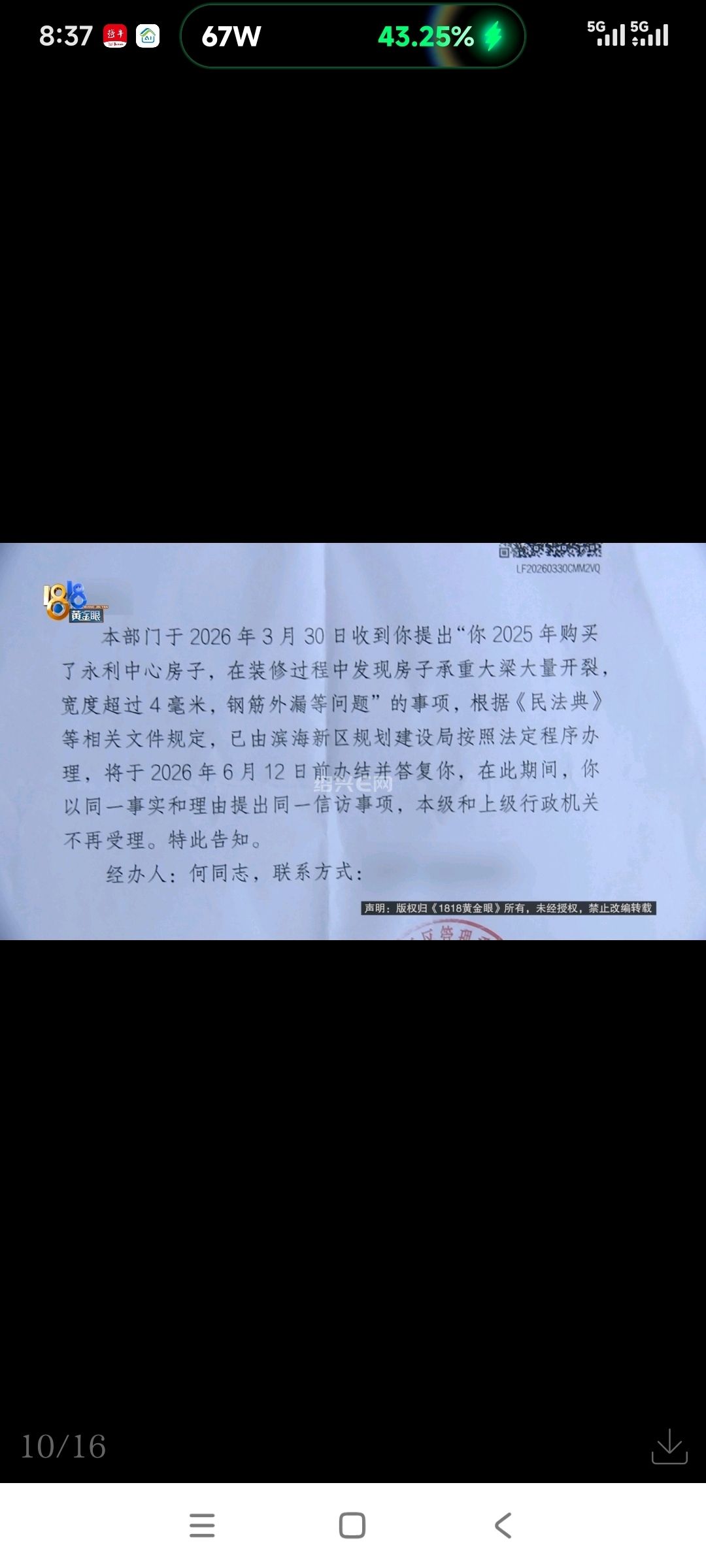 高先生:开发商答应我找第三方检测单位,有资质的检测一下,根据检测报告再出设计方案,再进行维修,维修没问题了再交付给我们。大概3月左右回复以后,就一直不回复了。我希望第一全部按程序走,你根据前面说的找第三方权威检测报告,维修加固或怎么样。而且我希望不光把我这一套修好,把整栋楼楼上楼下全都修好。为什么我要求这个?因为房子是整体的,你光修我开裂没用呀,上面也开裂,下面也开裂,时间久了有很多风险性的。