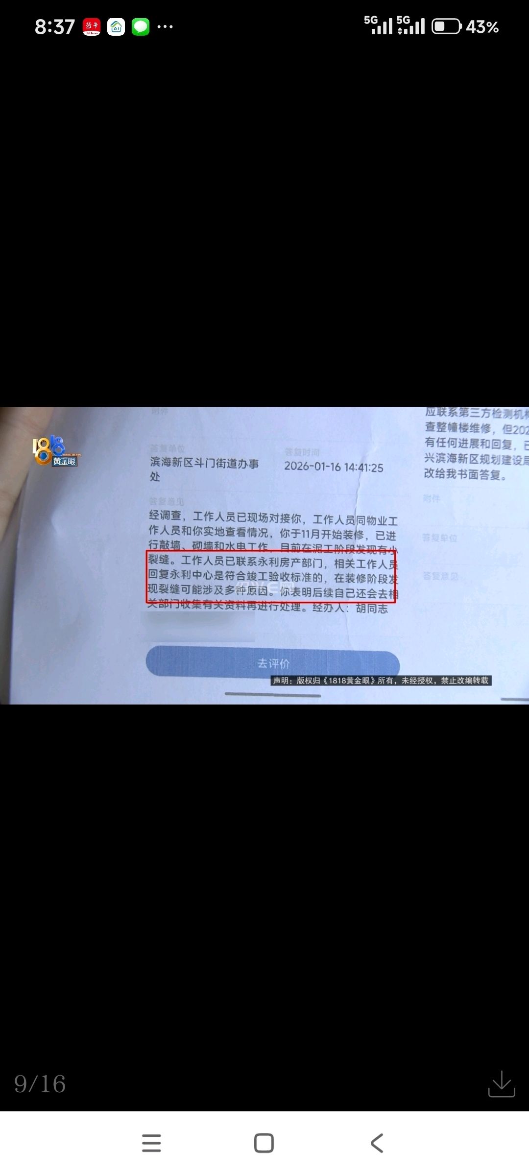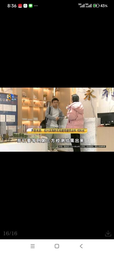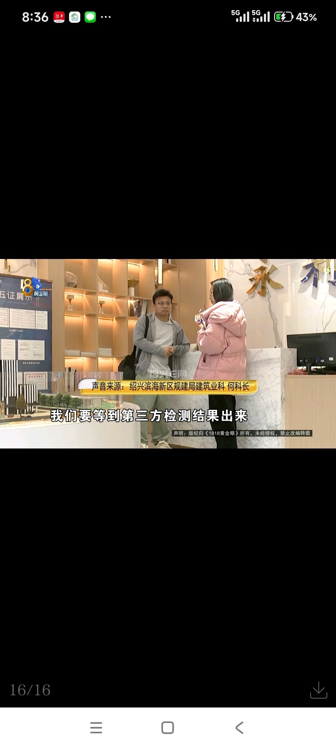 绍兴滨海新区规建局建筑业科 何科长:从专业角度讲,我们要等到第三方检测结果出来才能评判这个事情。他要整一幢楼的房屋鉴定,我们也把这个情况跟开发商说了,也约了时间。我们也想听听开发商情况了解得怎么样,包括开发商的态度怎么样,所以现在我们也不能给你们一个准确的答复。