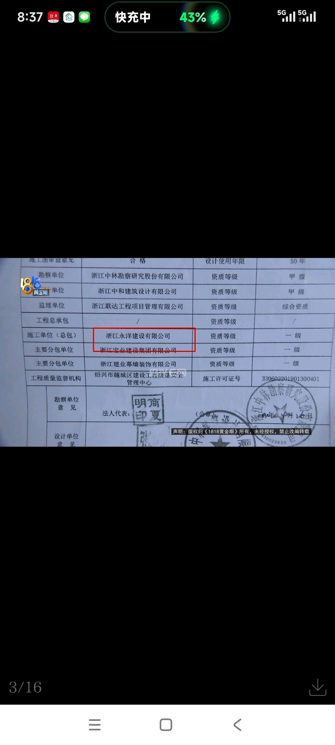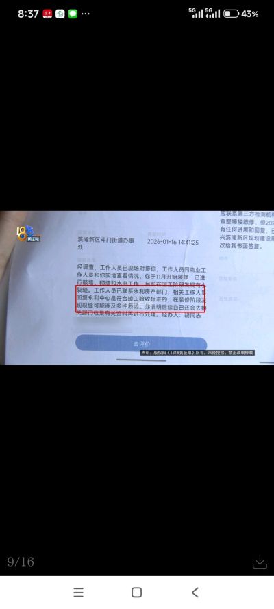浙江永洋建设有限公司 工作人员:这个梁上面有几道收缩裂缝,不是结构裂缝,这个事情给他修补一下,当时没有达成一致意见。滨海建设局刚刚昨天在联系了,叫我们几方坐下来聊一下这个事情。