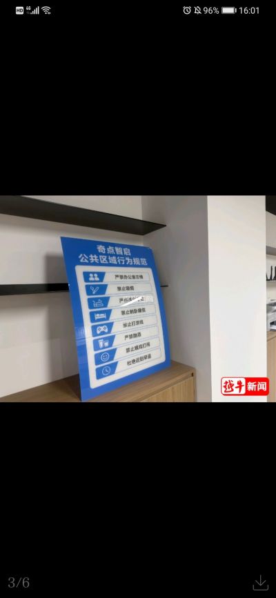 记者看到墙上张贴的《公共区域行为规范》列有多条禁令:办公室恋情、吸烟饮酒、嬉戏打闹、躺卧睡觉、打游戏、迟到早退等一概禁止。